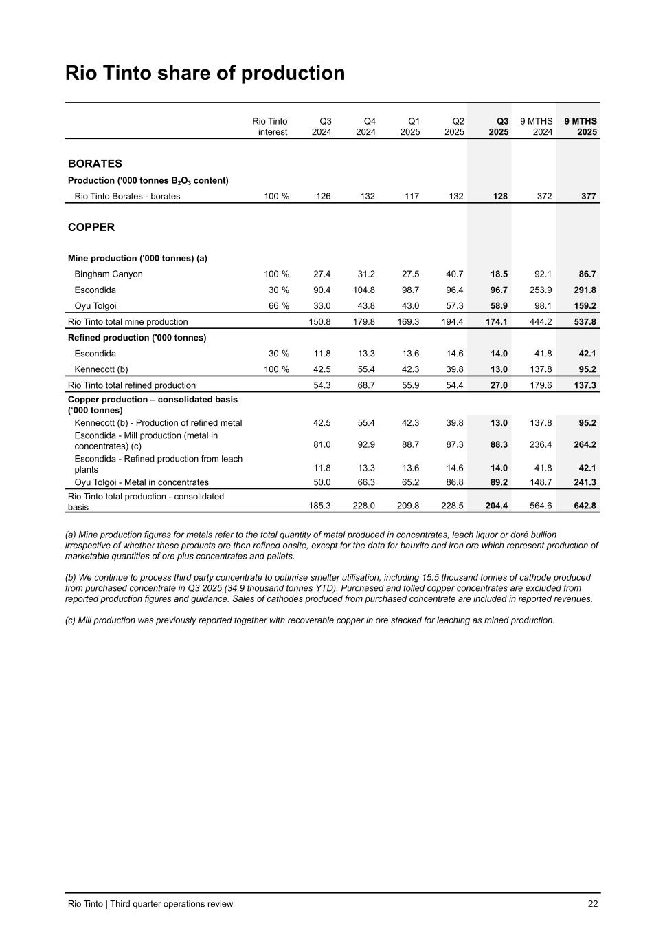 Rio Tinto share of production Rio Tinto interest Q3 2024 Q4 2024 Q1 2025 Q2 2025 Q3 2025 9 MTHS 2024 9 MTHS 2025 BORATES Production ('000 tonnes B2O3 content) Rio Tinto Borates - borates 100 % 126 132 117 132 128 372 377 COPPER Mine production ('000 tonnes) (a) Bingham Canyon 100 % 27.4 31.2 27.5 40.7 18.5 92.1 86.7 Escondida 30 % 90.4 104.8 98.7 96.4 96.7 253.9 291.8 Oyu Tolgoi 66 % 33.0 43.8 43.0 57.3 58.9 98.1 159.2 Rio Tinto total mine production 150.8 179.8 169.3 194.4 174.1 444.2 537.8 Refined production ('000 tonnes) Escondida 30 % 11.8 13.3 13.6 14.6 14.0 41.8 42.1 Kennecott (b) 100 % 42.5 55.4 42.3 39.8 13.0 137.8 95.2 Rio Tinto total refined production 54.3 68.7 55.9 54.4 27.0 179.6 137.3 Copper production – consolidated basis (‘000 tonnes) Kennecott (b) - Production of refined metal 42.5 55.4 42.3 39.8 13.0 137.8 95.2 Escondida - Mill production (metal in concentrates) (c) 81.0 92.9 88.7 87.3 88.3 236.4 264.2 Escondida - Refined production from leach plants 11.8 13.3 13.6 14.6 14.0 41.8 42.1 Oyu Tolgoi - Metal in concentrates 50.0 66.3 65.2 86.8 89.2 148.7 241.3 Rio Tinto total production - consolidated basis 185.3 228.0 209.8 228.5 204.4 564.6 642.8 (a) Mine production figures for metals refer to the total quantity of metal produced in concentrates, leach liquor or doré bullion irrespective of whether these products are then refined onsite, except for the data for bauxite and iron ore which represent production of marketable quantities of ore plus concentrates and pellets. (b) We continue to process third party concentrate to optimise smelter utilisation, including 15.5 thousand tonnes of cathode produced from purchased concentrate in Q3 2025 (34.9 thousand tonnes YTD). Purchased and tolled copper concentrates are excluded from reported production figures and guidance. Sales of cathodes produced from purchased concentrate are included in reported revenues. (c) Mill production was previously reported together with recoverable copper in ore stacked for leaching as mined production. Rio Tinto | Third quarter operations review 22