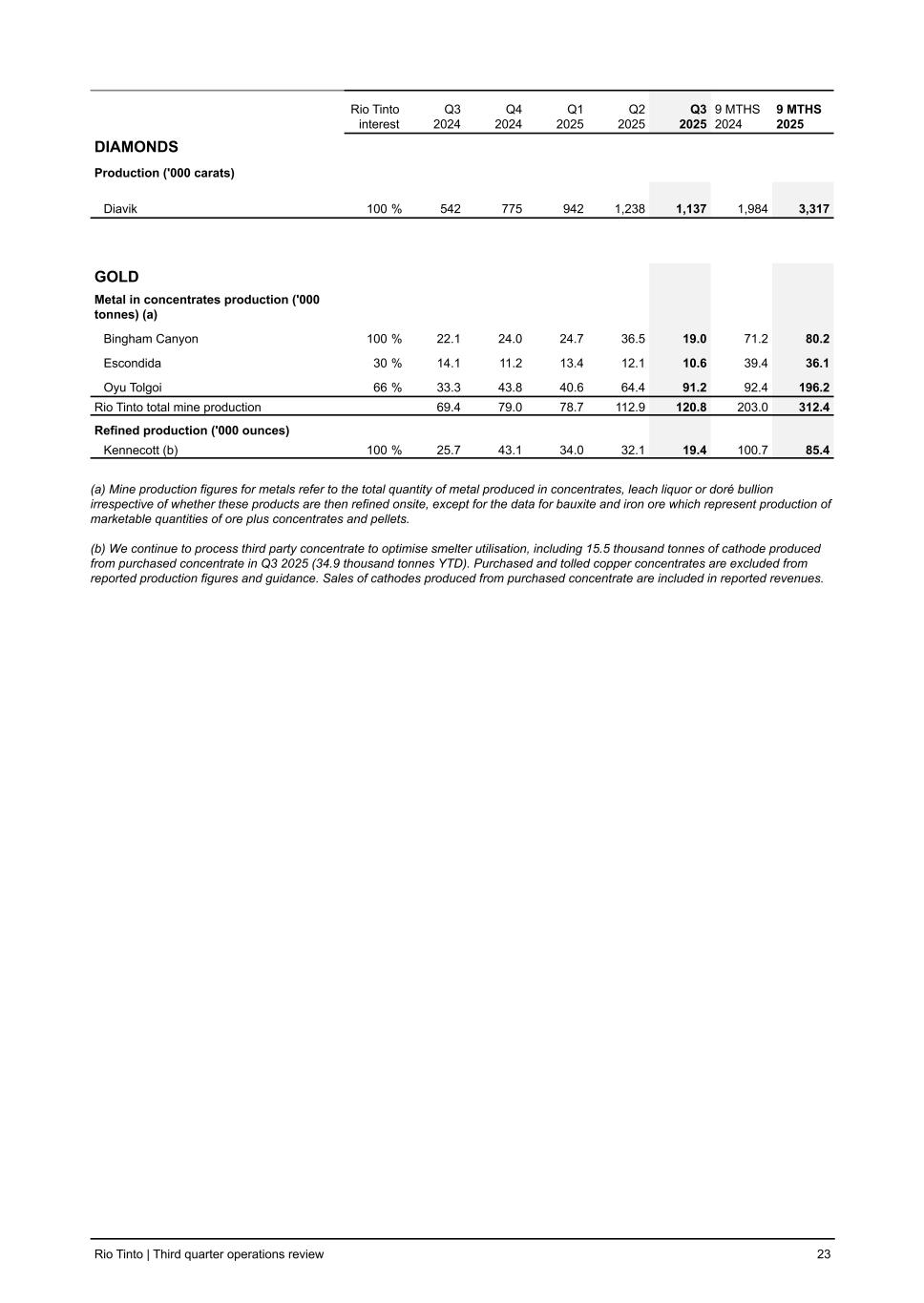 Rio Tinto interest Q3 2024 Q4 2024 Q1 2025 Q2 2025 Q3 2025 9 MTHS 2024 9 MTHS 2025 DIAMONDS Production ('000 carats) Diavik 100 % 542 775 942 1,238 1,137 1,984 3,317 GOLD Metal in concentrates production ('000 tonnes) (a) Bingham Canyon 100 % 22.1 24.0 24.7 36.5 19.0 71.2 80.2 Escondida 30 % 14.1 11.2 13.4 12.1 10.6 39.4 36.1 Oyu Tolgoi 66 % 33.3 43.8 40.6 64.4 91.2 92.4 196.2 Rio Tinto total mine production 69.4 79.0 78.7 112.9 120.8 203.0 312.4 Refined production ('000 ounces) Kennecott (b) 100 % 25.7 43.1 34.0 32.1 19.4 100.7 85.4 (a) Mine production figures for metals refer to the total quantity of metal produced in concentrates, leach liquor or doré bullion irrespective of whether these products are then refined onsite, except for the data for bauxite and iron ore which represent production of marketable quantities of ore plus concentrates and pellets. (b) We continue to process third party concentrate to optimise smelter utilisation, including 15.5 thousand tonnes of cathode produced from purchased concentrate in Q3 2025 (34.9 thousand tonnes YTD). Purchased and tolled copper concentrates are excluded from reported production figures and guidance. Sales of cathodes produced from purchased concentrate are included in reported revenues. Rio Tinto | Third quarter operations review 23