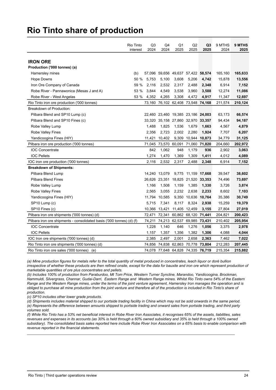 Rio Tinto share of production Rio Tinto interest Q3 2024 Q4 2024 Q1 2025 Q2 2025 Q3 2025 9 MTHS 2024 9 MTHS 2025 IRON ORE Production ('000 tonnes) (a) Hamersley mines (b) 57,096 59,656 49,637 57,422 58,574 165,160 165,633 Hope Downs 50 % 5,753 5,100 3,608 5,206 4,742 15,878 13,556 Iron Ore Company of Canada 59 % 2,116 2,532 2,317 2,488 2,348 6,914 7,152 Robe River - Pannawonica (Mesas J and A) 53 % 3,844 4,549 3,538 3,960 3,588 12,274 11,086 Robe River - West Angelas 53 % 4,352 4,265 3,308 4,472 4,917 11,347 12,697 Rio Tinto iron ore production ('000 tonnes) 73,160 76,102 62,408 73,548 74,168 211,574 210,124 Breakdown of Production: Pilbara Blend and SP10 Lump (c) 22,460 23,460 19,385 23,186 24,003 63,173 66,574 Pilbara Blend and SP10 Fines (c) 33,320 35,158 27,860 32,970 33,357 94,434 94,187 Robe Valley Lump 1,488 1,825 1,536 1,679 1,663 4,567 4,879 Robe Valley Fines 2,356 2,723 2,002 2,280 1,924 7,707 6,207 Yandicoogina Fines (HIY) 11,421 10,402 9,309 10,944 10,873 34,779 31,125 Pilbara iron ore production ('000 tonnes) 71,045 73,570 60,091 71,060 71,820 204,660 202,972 IOC Concentrate 842 1,062 948 1,179 936 2,902 3,063 IOC Pellets 1,274 1,470 1,369 1,309 1,411 4,012 4,089 IOC iron ore production ('000 tonnes) 2,116 2,532 2,317 2,488 2,348 6,914 7,152 Breakdown of Shipments: Pilbara Blend Lump 14,240 13,079 9,775 11,159 17,668 39,547 38,602 Pilbara Blend Fines 26,626 23,351 18,825 21,520 33,353 74,496 73,697 Robe Valley Lump 1,166 1,508 1,159 1,385 1,330 3,726 3,874 Robe Valley Fines 2,565 3,055 2,232 2,638 2,233 8,602 7,103 Yandicoogina Fines (HIY) 11,794 10,585 9,350 10,636 10,764 35,386 30,749 SP10 Lump (c) 5,715 7,341 8,117 8,324 2,938 15,259 19,379 SP10 Fines (c) 10,366 13,421 11,405 12,459 3,155 27,804 27,019 Pilbara iron ore shipments ('000 tonnes) (d) 72,471 72,341 60,862 68,120 71,441 204,821 200,423 Pilbara iron ore shipments - consolidated basis ('000 tonnes) (d) (f) 74,211 74,213 62,537 69,985 73,431 210,402 205,954 IOC Concentrate 1,228 1,140 646 1,276 1,056 3,375 2,978 IOC Pellets 1,157 1,357 1,356 1,382 1,306 4,088 4,044 IOC Iron ore shipments ('000 tonnes) (d) 2,385 2,497 2,001 2,658 2,363 7,462 7,022 Rio Tinto iron ore shipments ('000 tonnes) (d) 74,856 74,838 62,863 70,778 73,804 212,283 207,445 Rio Tinto iron ore sales ('000 tonnes) (e) 74,078 77,648 64,828 74,335 76,719 215,354 215,882 (a) Mine production figures for metals refer to the total quantity of metal produced in concentrates, leach liquor or doré bullion irrespective of whether these products are then refined onsite, except for the data for bauxite and iron ore which represent production of marketable quantities of ore plus concentrates and pellets. (b) Includes 100% of production from Paraburdoo, Mt Tom Price, Western Turner Syncline, Marandoo, Yandicoogina, Brockman, Nammuldi, Silvergrass, Channar, Gudai-Darri, Eastern Range and Western Range mines. Whilst Rio Tinto owns 54% of the Eastern Range and the Western Range mines, under the terms of the joint venture agreement, Hamersley Iron manages the operation and is obliged to purchase all mine production from the joint venture and therefore all of the production is included in Rio Tinto's share of production. (c) SP10 includes other lower grade products. (d) Shipments includes material shipped to our portside trading facility in China which may not be sold onwards in the same period. (e) Represents the difference between amounts shipped to portside trading and onward sales from portside trading, and third party volumes sold. (f) While Rio Tinto has a 53% net beneficial interest in Robe River Iron Associates, it recognises 65% of the assets, liabilities, sales revenues and expenses in its accounts (as 30% is held through a 60% owned subsidiary and 35% is held through a 100% owned subsidiary). The consolidated basis sales reported here include Robe River Iron Associates on a 65% basis to enable comparison with revenue reported in the financial statements. Rio Tinto | Third quarter operations review 24