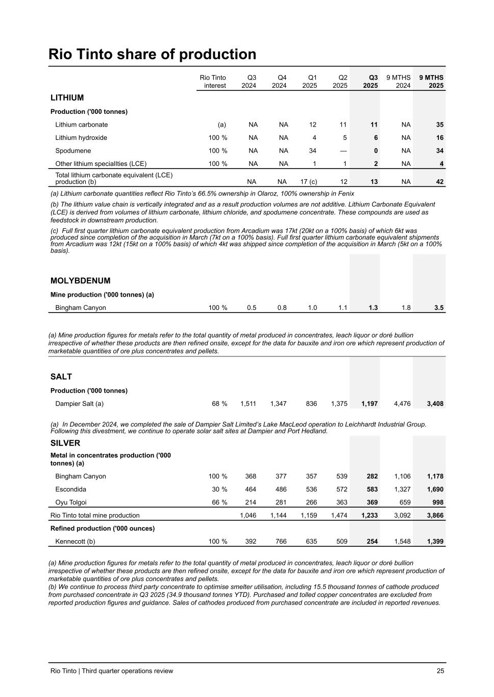 Rio Tinto share of production Rio Tinto interest Q3 2024 Q4 2024 Q1 2025 Q2 2025 Q3 2025 9 MTHS 2024 9 MTHS 2025 LITHIUM Production ('000 tonnes) Lithium carbonate (a) NA NA 12 11 11 NA 35 Lithium hydroxide 100 % NA NA 4 5 6 NA 16 Spodumene 100 % NA NA 34 — 0 NA 34 Other lithium specialIties (LCE) 100 % NA NA 1 1 2 NA 4 Total lithium carbonate equivalent (LCE) production (b) NA NA 17 (c) 12 13 NA 42 (a) Lithium carbonate quantities reflect Rio Tinto’s 66.5% ownership in Olaroz, 100% ownership in Fenix (b) The lithium value chain is vertically integrated and as a result production volumes are not additive. Lithium Carbonate Equivalent (LCE) is derived from volumes of lithium carbonate, lithium chloride, and spodumene concentrate. These compounds are used as feedstock in downstream production. (c) Full first quarter lithium carbonate equivalent production from Arcadium was 17kt (20kt on a 100% basis) of which 6kt was produced since completion of the acquisition in March (7kt on a 100% basis). Full first quarter lithium carbonate equivalent shipments from Arcadium was 12kt (15kt on a 100% basis) of which 4kt was shipped since completion of the acquisition in March (5kt on a 100% basis). MOLYBDENUM Mine production ('000 tonnes) (a) Bingham Canyon 100 % 0.5 0.8 1.0 1.1 1.3 1.8 3.5 (a) Mine production figures for metals refer to the total quantity of metal produced in concentrates, leach liquor or doré bullion irrespective of whether these products are then refined onsite, except for the data for bauxite and iron ore which represent production of marketable quantities of ore plus concentrates and pellets. SALT Production ('000 tonnes) Dampier Salt (a) 68 % 1,511 1,347 836 1,375 1,197 4,476 3,408 (a) In December 2024, we completed the sale of Dampier Salt Limited’s Lake MacLeod operation to Leichhardt Industrial Group. Following this divestment, we continue to operate solar salt sites at Dampier and Port Hedland. SILVER Metal in concentrates production ('000 tonnes) (a) Bingham Canyon 100 % 368 377 357 539 282 1,106 1,178 Escondida 30 % 464 486 536 572 583 1,327 1,690 Oyu Tolgoi 66 % 214 281 266 363 369 659 998 Rio Tinto total mine production 1,046 1,144 1,159 1,474 1,233 3,092 3,866 Refined production ('000 ounces) Kennecott (b) 100 % 392 766 635 509 254 1,548 1,399 (a) Mine production figures for metals refer to the total quantity of metal produced in concentrates, leach liquor or doré bullion irrespective of whether these products are then refined onsite, except for the data for bauxite and iron ore which represent production of marketable quantities of ore plus concentrates and pellets. (b) We continue to process third party concentrate to optimise smelter utilisation, including 15.5 thousand tonnes of cathode produced from purchased concentrate in Q3 2025 (34.9 thousand tonnes YTD). Purchased and tolled copper concentrates are excluded from reported production figures and guidance. Sales of cathodes produced from purchased concentrate are included in reported revenues. Rio Tinto | Third quarter operations review 25