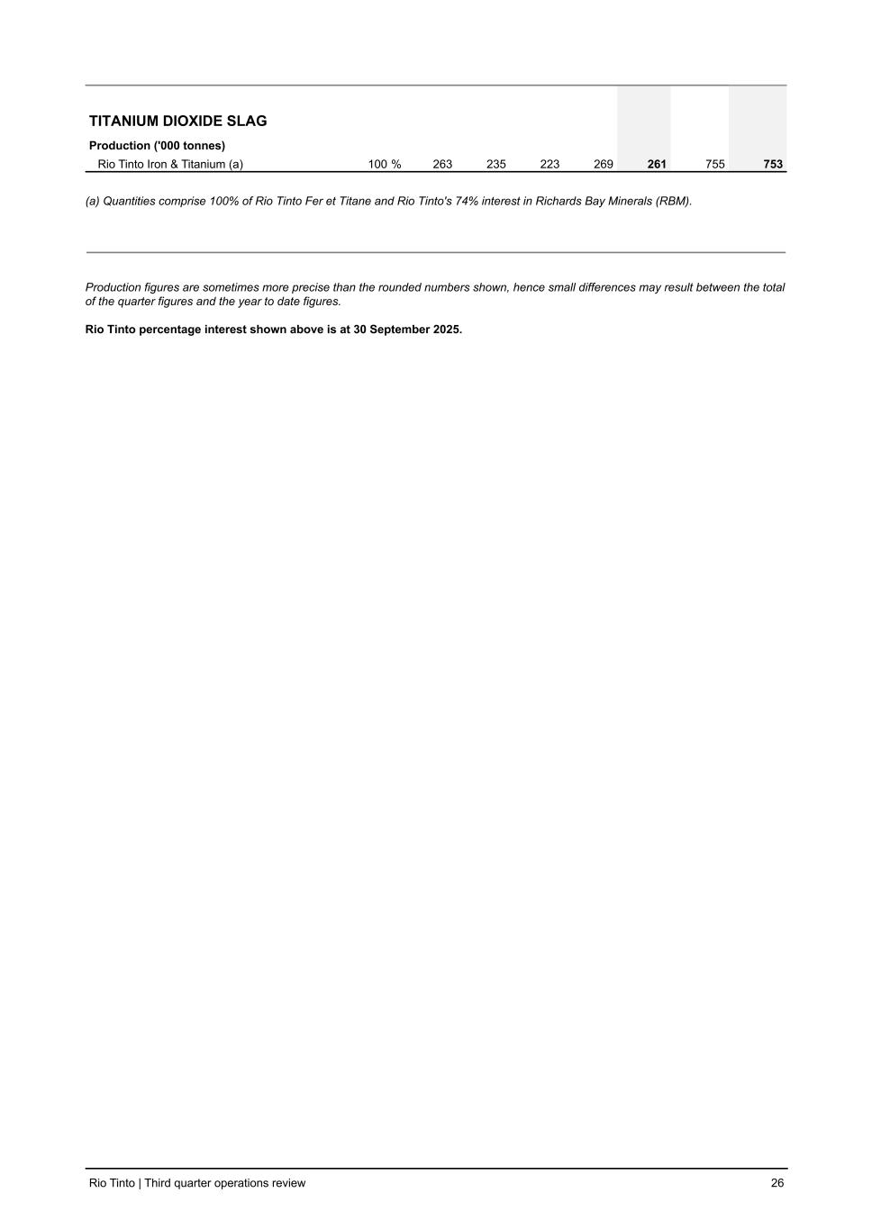 TITANIUM DIOXIDE SLAG Production ('000 tonnes) Rio Tinto Iron & Titanium (a) 100 % 263 235 223 269 261 755 753 (a) Quantities comprise 100% of Rio Tinto Fer et Titane and Rio Tinto's 74% interest in Richards Bay Minerals (RBM). Production figures are sometimes more precise than the rounded numbers shown, hence small differences may result between the total of the quarter figures and the year to date figures. Rio Tinto percentage interest shown above is at 30 September 2025. Rio Tinto | Third quarter operations review 26