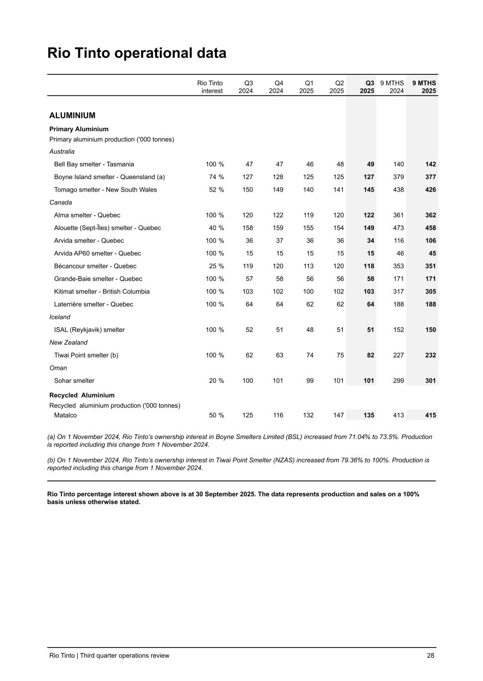 Rio Tinto operational data Rio Tinto interest Q3 2024 Q4 2024 Q1 2025 Q2 2025 Q3 2025 9 MTHS 2024 9 MTHS 2025 ALUMINIUM Primary Aluminium Primary aluminium production ('000 tonnes) Australia Bell Bay smelter - Tasmania 100 % 47 47 46 48 49 140 142 Boyne Island smelter - Queensland (a) 74 % 127 128 125 125 127 379 377 Tomago smelter - New South Wales 52 % 150 149 140 141 145 438 426 Canada Alma smelter - Quebec 100 % 120 122 119 120 122 361 362 Alouette (Sept-Îles) smelter - Quebec 40 % 158 159 155 154 149 473 458 Arvida smelter - Quebec 100 % 36 37 36 36 34 116 106 Arvida AP60 smelter - Quebec 100 % 15 15 15 15 15 46 45 Bécancour smelter - Quebec 25 % 119 120 113 120 118 353 351 Grande-Baie smelter - Quebec 100 % 57 58 56 56 58 171 171 Kitimat smelter - British Columbia 100 % 103 102 100 102 103 317 305 Laterrière smelter - Quebec 100 % 64 64 62 62 64 188 188 Iceland ISAL (Reykjavik) smelter 100 % 52 51 48 51 51 152 150 New Zealand Tiwai Point smelter (b) 100 % 62 63 74 75 82 227 232 Oman Sohar smelter 20 % 100 101 99 101 101 299 301 Recycled Aluminium Recycled aluminium production ('000 tonnes) Matalco 50 % 125 116 132 147 135 413 415 (a) On 1 November 2024, Rio Tinto’s ownership interest in Boyne Smelters Limited (BSL) increased from 71.04% to 73.5%. Production is reported including this change from 1 November 2024. (b) On 1 November 2024, Rio Tinto’s ownership interest in Tiwai Point Smelter (NZAS) increased from 79.36% to 100%. Production is reported including this change from 1 November 2024. Rio Tinto percentage interest shown above is at 30 September 2025. The data represents production and sales on a 100% basis unless otherwise stated. Rio Tinto | Third quarter operations review 28