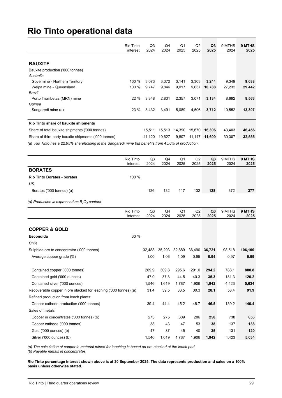 Rio Tinto operational data Rio Tinto interest Q3 2024 Q4 2024 Q1 2025 Q2 2025 Q3 2025 9 MTHS 2024 9 MTHS 2025 BAUXITE Bauxite production ('000 tonnes) Australia Gove mine - Northern Territory 100 % 3,073 3,372 3,141 3,303 3,244 9,349 9,688 Weipa mine - Queensland 100 % 9,747 9,846 9,017 9,637 10,788 27,232 29,442 Brazil Porto Trombetas (MRN) mine 22 % 3,348 2,831 2,357 3,071 3,134 8,692 8,563 Guinea Sangaredi mine (a) 23 % 3,432 3,491 5,089 4,506 3,712 10,552 13,307 Rio Tinto share of bauxite shipments Share of total bauxite shipments ('000 tonnes) 15,511 15,513 14,390 15,670 16,396 43,403 46,456 Share of third party bauxite shipments ('000 tonnes) 11,120 10,627 9,807 11,147 11,600 30,307 32,555 (a) Rio Tinto has a 22.95% shareholding in the Sangaredi mine but benefits from 45.0% of production. Rio Tinto interest Q3 2024 Q4 2024 Q1 2025 Q2 2025 Q3 2025 9 MTHS 2024 9 MTHS 2025 BORATES Rio Tinto Borates - borates 100 % US Borates ('000 tonnes) (a) 126 132 117 132 128 372 377 (a) Production is expressed as B2O3 content. Rio Tinto interest Q3 2024 Q4 2024 Q1 2025 Q2 2025 Q3 2025 9 MTHS 2024 9 MTHS 2025 COPPER & GOLD Escondida 30 % Chile Sulphide ore to concentrator ('000 tonnes) 32,488 35,293 32,889 36,490 36,721 98,518 106,100 Average copper grade (%) 1.00 1.06 1.09 0.95 0.94 0.97 0.99 Contained copper ('000 tonnes) 269.9 309.8 295.6 291.0 294.2 788.1 880.8 Contained gold ('000 ounces) 47.0 37.3 44.5 40.3 35.3 131.3 120.2 Contained silver ('000 ounces) 1,546 1,619 1,787 1,906 1,942 4,423 5,634 Recoverable copper in ore stacked for leaching ('000 tonnes) (a) 31.4 39.5 33.5 30.3 28.1 58.4 91.9 Refined production from leach plants: Copper cathode production ('000 tonnes) 39.4 44.4 45.2 48.7 46.5 139.2 140.4 Sales of metals: Copper in concentrates ('000 tonnes) (b) 273 275 309 286 258 738 853 Copper cathode ('000 tonnes) 38 43 47 53 38 137 138 Gold ('000 ounces) (b) 47 37 45 40 35 131 120 Silver ('000 ounces) (b) 1,546 1,619 1,787 1,906 1,942 4,423 5,634 (a) The calculation of copper in material mined for leaching is based on ore stacked at the leach pad. (b) Payable metals in concentrates Rio Tinto percentage interest shown above is at 30 September 2025. The data represents production and sales on a 100% basis unless otherwise stated. Rio Tinto | Third quarter operations review 29