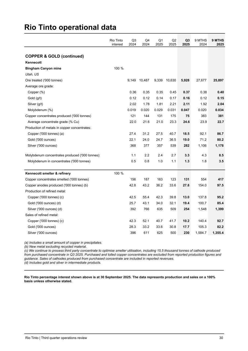 Rio Tinto operational data Rio Tinto interest Q3 2024 Q4 2024 Q1 2025 Q2 2025 Q3 2025 9 MTHS 2024 9 MTHS 2025 COPPER & GOLD (continued) Kennecott Bingham Canyon mine 100 % Utah, US Ore treated ('000 tonnes) 9,149 10,487 9,339 10,630 5,928 27,677 25,897 Average ore grade: Copper (%) 0.36 0.35 0.35 0.45 0.37 0.38 0.40 Gold (g/t) 0.12 0.12 0.14 0.17 0.16 0.12 0.15 Silver (g/t) 2.02 1.78 1.81 2.21 2.11 1.92 2.04 Molybdenum (%) 0.019 0.020 0.029 0.031 0.047 0.020 0.034 Copper concentrates produced ('000 tonnes) 121 144 131 175 75 383 381 Average concentrate grade (% Cu) 22.0 21.6 21.0 23.3 24.6 23.9 22.7 Production of metals in copper concentrates: Copper ('000 tonnes) (a) 27.4 31.2 27.5 40.7 18.5 92.1 86.7 Gold ('000 ounces) 22.1 24.0 24.7 36.5 19.0 71.2 80.2 Silver ('000 ounces) 368 377 357 539 282 1,106 1,178 Molybdenum concentrates produced ('000 tonnes): 1.1 2.2 2.4 2.7 3.3 4.3 8.5 Molybdenum in concentrates ('000 tonnes) 0.5 0.8 1.0 1.1 1.3 1.8 3.5 Kennecott smelter & refinery 100 % Copper concentrates smelted ('000 tonnes) 156 187 163 123 131 554 417 Copper anodes produced ('000 tonnes) (b) 42.8 43.2 36.2 33.6 27.8 154.0 97.5 Production of refined metal: Copper ('000 tonnes) (c) 42.5 55.4 42.3 39.8 13.0 137.8 95.2 Gold ('000 ounces) (d) 25.7 43.1 34.0 32.1 19.4 100.7 85.4 Silver ('000 ounces) (d) 392 766 635 509 254 1,548 1,399 Sales of refined metal: Copper ('000 tonnes) (c) 42.3 52.1 40.7 41.7 10.2 140.4 92.7 Gold ('000 ounces) 28.3 33.2 33.6 30.8 17.7 105.3 82.2 Silver ('000 ounces) 396 611 625 500 230 1,584.7 1,355.4 (a) Includes a small amount of copper in precipitates. (b) New metal excluding recycled material. (c) We continue to process third party concentrate to optimise smelter utilisation, including 15.5 thousand tonnes of cathode produced from purchased concentrate in Q3 2025. Purchased and tolled copper concentrates are excluded from reported production figures and guidance. Sales of cathodes produced from purchased concentrate are included in reported revenues. (d) Includes gold and silver in intermediate products. Rio Tinto percentage interest shown above is at 30 September 2025. The data represents production and sales on a 100% basis unless otherwise stated. Rio Tinto | Third quarter operations review 30