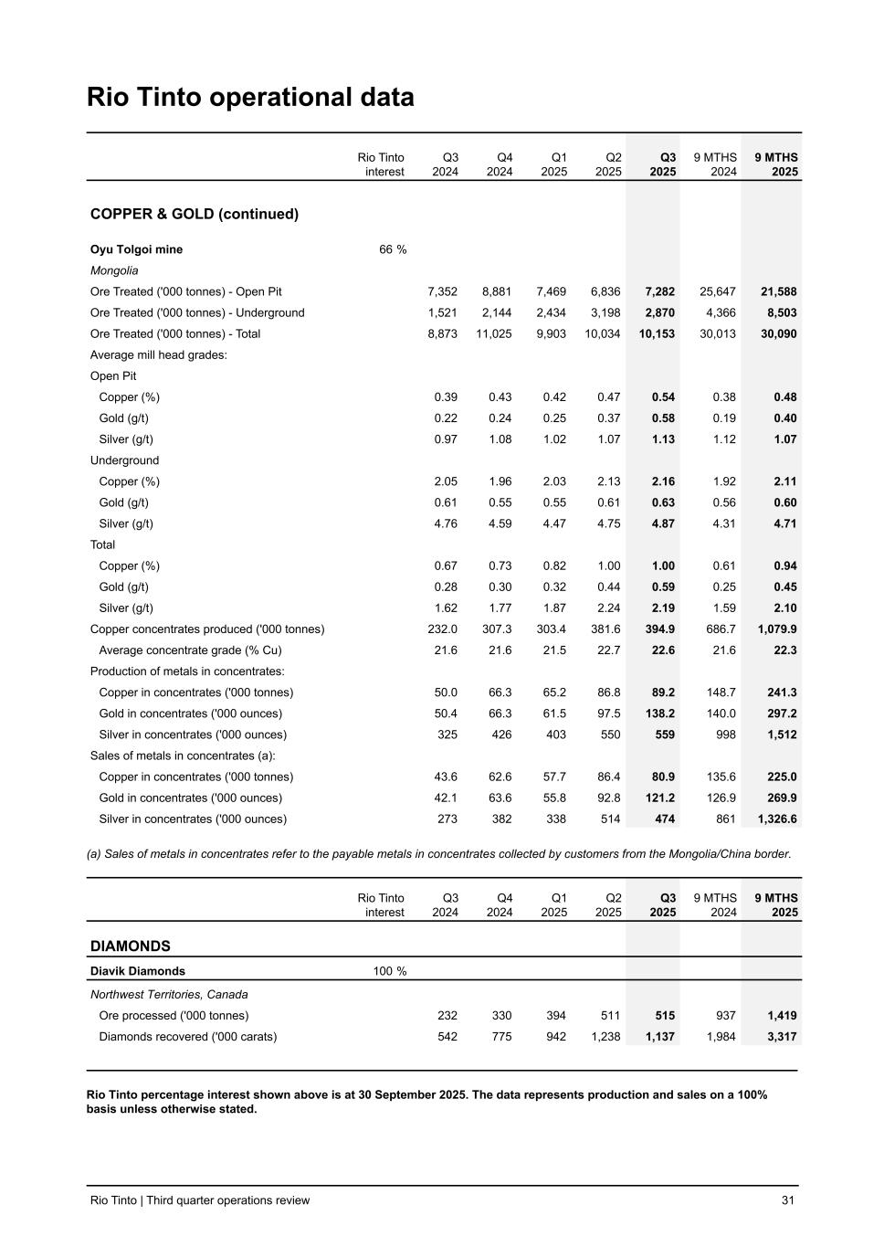 Rio Tinto operational data Rio Tinto interest Q3 2024 Q4 2024 Q1 2025 Q2 2025 Q3 2025 9 MTHS 2024 9 MTHS 2025 COPPER & GOLD (continued) Oyu Tolgoi mine 66 % Mongolia Ore Treated ('000 tonnes) - Open Pit 7,352 8,881 7,469 6,836 7,282 25,647 21,588 Ore Treated ('000 tonnes) - Underground 1,521 2,144 2,434 3,198 2,870 4,366 8,503 Ore Treated ('000 tonnes) - Total 8,873 11,025 9,903 10,034 10,153 30,013 30,090 Average mill head grades: Open Pit Copper (%) 0.39 0.43 0.42 0.47 0.54 0.38 0.48 Gold (g/t) 0.22 0.24 0.25 0.37 0.58 0.19 0.40 Silver (g/t) 0.97 1.08 1.02 1.07 1.13 1.12 1.07 Underground Copper (%) 2.05 1.96 2.03 2.13 2.16 1.92 2.11 Gold (g/t) 0.61 0.55 0.55 0.61 0.63 0.56 0.60 Silver (g/t) 4.76 4.59 4.47 4.75 4.87 4.31 4.71 Total Copper (%) 0.67 0.73 0.82 1.00 1.00 0.61 0.94 Gold (g/t) 0.28 0.30 0.32 0.44 0.59 0.25 0.45 Silver (g/t) 1.62 1.77 1.87 2.24 2.19 1.59 2.10 Copper concentrates produced ('000 tonnes) 232.0 307.3 303.4 381.6 394.9 686.7 1,079.9 Average concentrate grade (% Cu) 21.6 21.6 21.5 22.7 22.6 21.6 22.3 Production of metals in concentrates: Copper in concentrates ('000 tonnes) 50.0 66.3 65.2 86.8 89.2 148.7 241.3 Gold in concentrates ('000 ounces) 50.4 66.3 61.5 97.5 138.2 140.0 297.2 Silver in concentrates ('000 ounces) 325 426 403 550 559 998 1,512 Sales of metals in concentrates (a): Copper in concentrates ('000 tonnes) 43.6 62.6 57.7 86.4 80.9 135.6 225.0 Gold in concentrates ('000 ounces) 42.1 63.6 55.8 92.8 121.2 126.9 269.9 Silver in concentrates ('000 ounces) 273 382 338 514 474 861 1,326.6 (a) Sales of metals in concentrates refer to the payable metals in concentrates collected by customers from the Mongolia/China border. Rio Tinto interest Q3 2024 Q4 2024 Q1 2025 Q2 2025 Q3 2025 9 MTHS 2024 9 MTHS 2025 DIAMONDS Diavik Diamonds 100 % Northwest Territories, Canada Ore processed ('000 tonnes) 232 330 394 511 515 937 1,419 Diamonds recovered ('000 carats) 542 775 942 1,238 1,137 1,984 3,317 Rio Tinto percentage interest shown above is at 30 September 2025. The data represents production and sales on a 100% basis unless otherwise stated. Rio Tinto | Third quarter operations review 31