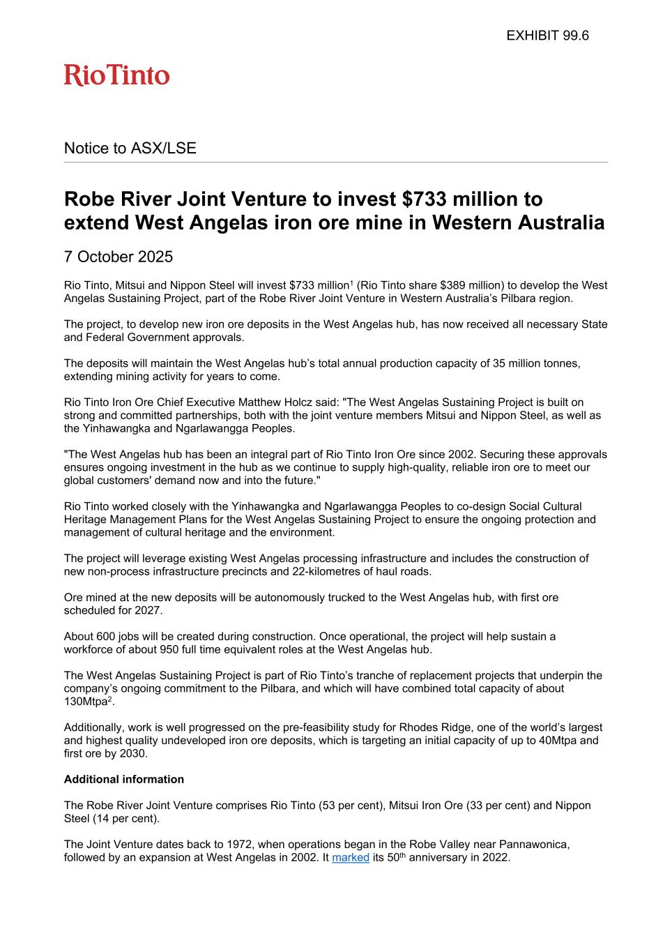 Notice to ASX/LSE Robe River Joint Venture to invest $733 million to extend West Angelas iron ore mine in Western Australia 7 October 2025 Rio Tinto, Mitsui and Nippon Steel will invest $733 million1 (Rio Tinto share $389 million) to develop the West Angelas Sustaining Project, part of the Robe River Joint Venture in Western Australia’s Pilbara region. The project, to develop new iron ore deposits in the West Angelas hub, has now received all necessary State and Federal Government approvals. The deposits will maintain the West Angelas hub’s total annual production capacity of 35 million tonnes, extending mining activity for years to come. Rio Tinto Iron Ore Chief Executive Matthew Holcz said: "The West Angelas Sustaining Project is built on strong and committed partnerships, both with the joint venture members Mitsui and Nippon Steel, as well as the Yinhawangka and Ngarlawangga Peoples. "The West Angelas hub has been an integral part of Rio Tinto Iron Ore since 2002. Securing these approvals ensures ongoing investment in the hub as we continue to supply high-quality, reliable iron ore to meet our global customers' demand now and into the future." Rio Tinto worked closely with the Yinhawangka and Ngarlawangga Peoples to co-design Social Cultural Heritage Management Plans for the West Angelas Sustaining Project to ensure the ongoing protection and management of cultural heritage and the environment. The project will leverage existing West Angelas processing infrastructure and includes the construction of new non-process infrastructure precincts and 22-kilometres of haul roads. Ore mined at the new deposits will be autonomously trucked to the West Angelas hub, with first ore scheduled for 2027. About 600 jobs will be created during construction. Once operational, the project will help sustain a workforce of about 950 full time equivalent roles at the West Angelas hub. The West Angelas Sustaining Project is part of Rio Tinto’s tranche of replacement projects that underpin the company’s ongoing commitment to the Pilbara, and which will have combined total capacity of about 130Mtpa2. Additionally, work is well progressed on the pre-feasibility study for Rhodes Ridge, one of the world’s largest and highest quality undeveloped iron ore deposits, which is targeting an initial capacity of up to 40Mtpa and first ore by 2030. Additional information The Robe River Joint Venture comprises Rio Tinto (53 per cent), Mitsui Iron Ore (33 per cent) and Nippon Steel (14 per cent). The Joint Venture dates back to 1972, when operations began in the Robe Valley near Pannawonica, followed by an expansion at West Angelas in 2002. It marked its 50th anniversary in 2022. EXHIBIT 99.6