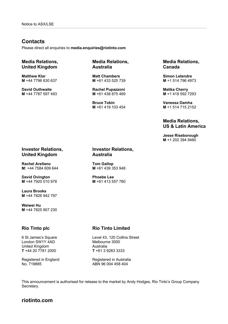 Notice to ASX/LSE Contacts Please direct all enquiries to media.enquiries@riotinto.com Media Relations, United Kingdom Matthew Klar M +44 7796 630 637 David Outhwaite M +44 7787 597 493 Media Relations, Australia Matt Chambers M +61 433 525 739 Rachel Pupazzoni M +61 438 875 469 Bruce Tobin  M +61 419 103 454 Media Relations, Canada Simon Letendre M +1 514 796 4973 Malika Cherry M +1 418 592 7293 Vanessa Damha M +1 514 715 2152 Media Relations, US & Latin America Jesse Riseborough M +1 202 394 9480 Investor Relations, United Kingdom Rachel Arellano M: +44 7584 609 644 David Ovington M +44 7920 010 978 Laura Brooks M +44 7826 942 797 Weiwei Hu M +44 7825 907 230 Investor Relations, Australia Tom Gallop M +61 439 353 948 Phoebe Lee M +61 413 557 780 Rio Tinto plc 6 St James’s Square London SW1Y 4AD United Kingdom T +44 20 7781 2000 Registered in England No. 719885 Rio Tinto Limited Level 43, 120 Collins Street Melbourne 3000 Australia T +61 3 9283 3333 Registered in Australia ABN 96 004 458 404 This announcement is authorised for release to the market by Andy Hodges, Rio Tinto’s Group Company Secretary. riotinto.com