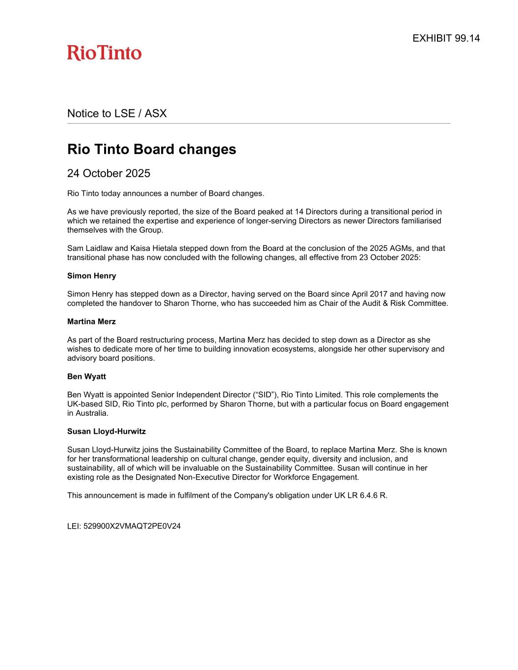 Notice to LSE / ASX Rio Tinto Board changes 24 October 2025 Rio Tinto today announces a number of Board changes. As we have previously reported, the size of the Board peaked at 14 Directors during a transitional period in which we retained the expertise and experience of longer-serving Directors as newer Directors familiarised themselves with the Group. Sam Laidlaw and Kaisa Hietala stepped down from the Board at the conclusion of the 2025 AGMs, and that transitional phase has now concluded with the following changes, all effective from 23 October 2025: Simon Henry Simon Henry has stepped down as a Director, having served on the Board since April 2017 and having now completed the handover to Sharon Thorne, who has succeeded him as Chair of the Audit & Risk Committee. Martina Merz As part of the Board restructuring process, Martina Merz has decided to step down as a Director as she wishes to dedicate more of her time to building innovation ecosystems, alongside her other supervisory and advisory board positions. Ben Wyatt Ben Wyatt is appointed Senior Independent Director (“SID”), Rio Tinto Limited. This role complements the UK-based SID, Rio Tinto plc, performed by Sharon Thorne, but with a particular focus on Board engagement in Australia. Susan Lloyd-Hurwitz Susan Lloyd-Hurwitz joins the Sustainability Committee of the Board, to replace Martina Merz. She is known for her transformational leadership on cultural change, gender equity, diversity and inclusion, and sustainability, all of which will be invaluable on the Sustainability Committee. Susan will continue in her existing role as the Designated Non-Executive Director for Workforce Engagement. This announcement is made in fulfilment of the Company's obligation under UK LR 6.4.6 R. LEI: EXHIBIT 99.14