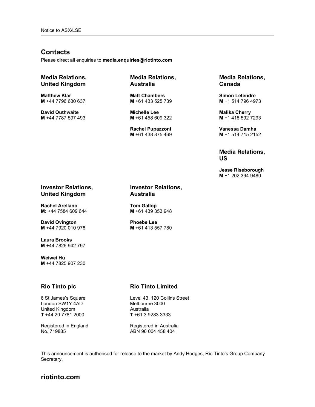 Notice to ASX/LSE Contacts Please direct all enquiries to media.enquiries@riotinto.com Media Relations, United Kingdom Matthew Klar M +44 7796 630 637 David Outhwaite M +44 7787 597 493 Media Relations, Australia Matt Chambers M +61 433 525 739 Michelle Lee M +61 458 609 322 Rachel Pupazzoni M +61 438 875 469 Media Relations, Canada Simon Letendre M +1 514 796 4973 Malika Cherry M +1 418 592 7293 Vanessa Damha M +1 514 715 2152 Media Relations, US Jesse Riseborough M +1 202 394 9480 Investor Relations, United Kingdom Rachel Arellano M: +44 7584 609 644 David Ovington M +44 7920 010 978 Laura Brooks M +44 7826 942 797 Weiwei Hu M +44 7825 907 230 Investor Relations, Australia Tom Gallop M +61 439 353 948 Phoebe Lee M +61 413 557 780 Rio Tinto plc 6 St James’s Square London SW1Y 4AD United Kingdom T +44 20 7781 2000 Registered in England No. 719885 Rio Tinto Limited Level 43, 120 Collins Street Melbourne 3000 Australia T +61 3 9283 3333 Registered in Australia ABN 96 004 458 404 This announcement is authorised for release to the market by Andy Hodges, Rio Tinto’s Group Company Secretary. riotinto.com