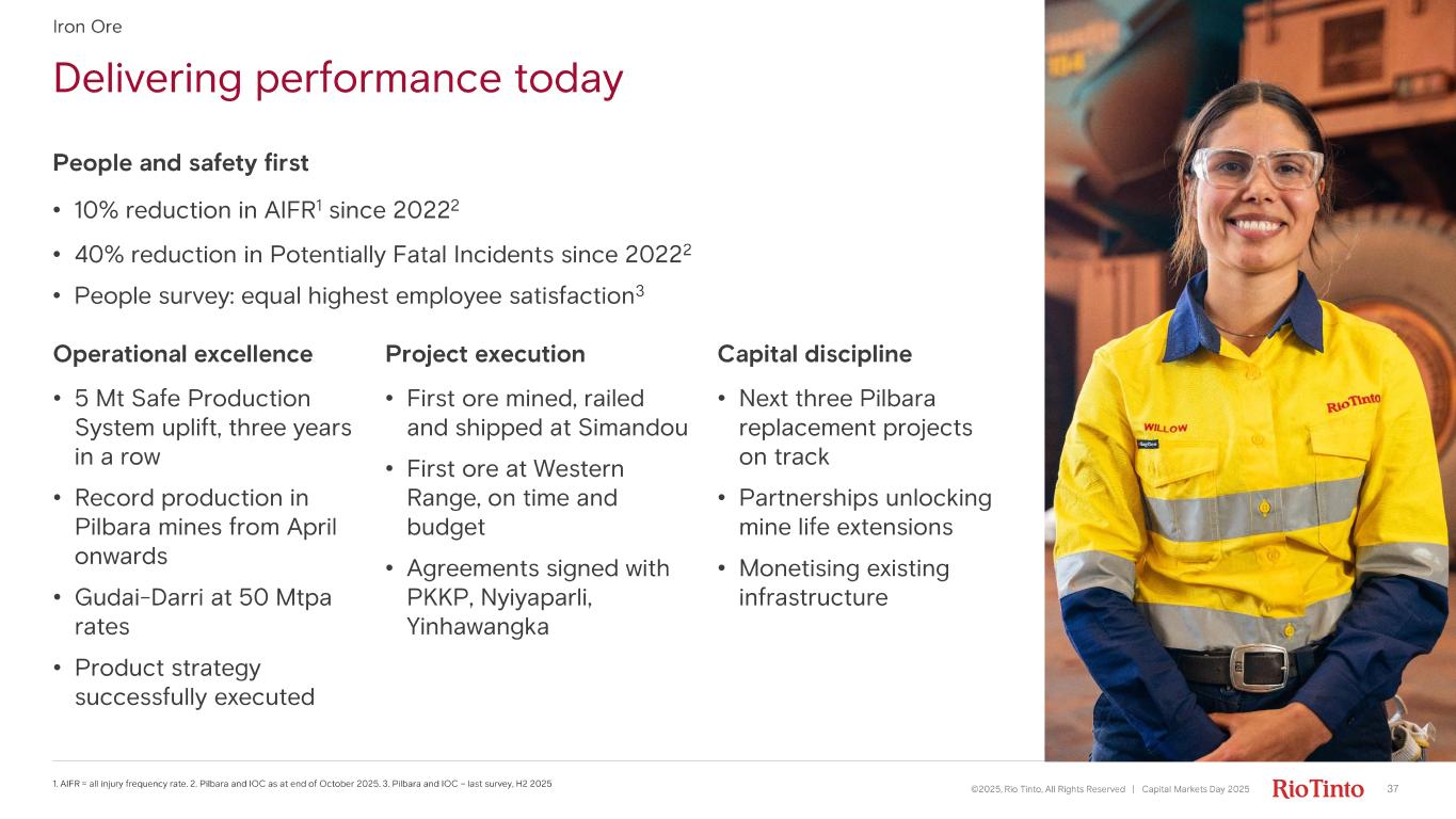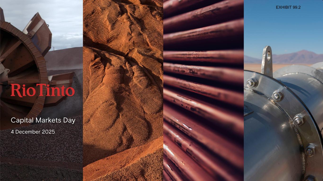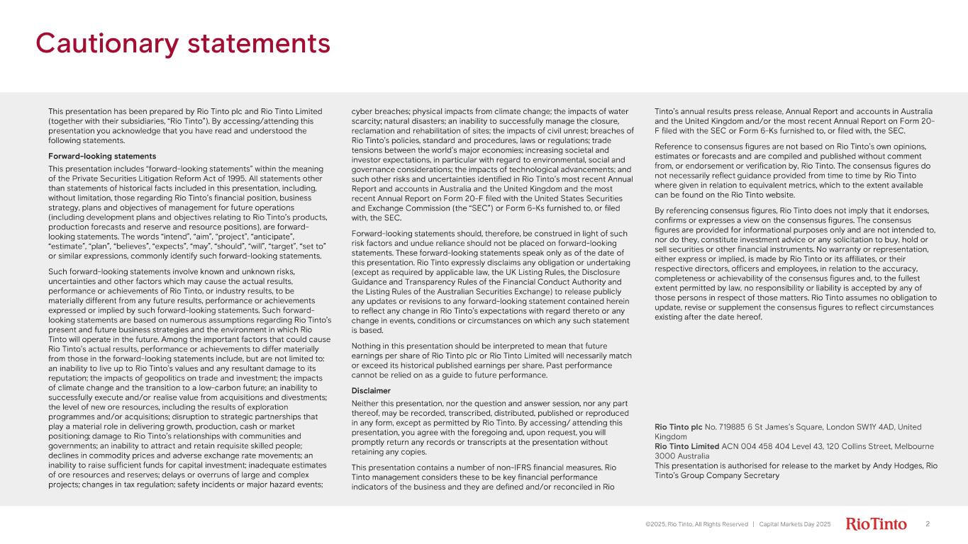 Cautionary statements 2©2025, Rio Tinto, All Rights Reserved | Capital Markets Day 2025 This presentation has been prepared by Rio Tinto plc and Rio Tinto Limited (together with their subsidiaries, “Rio Tinto”). By accessing/attending this presentation you acknowledge that you have read and understood the following statements. Forward - looking statements This presentation includes “forward - looking statements” within the meaning of the Private Securities Litigation Reform Act of 1995. All statements other than statements of historical facts included in this presentation, including, without limitation, those regarding Rio Tinto’s financial position, business strategy, plans and objectives of management for future operations (including development plans and objectives relating to Rio Tinto’s products, production forecasts and reserve and resource positions), are forward - looking statements. The words “intend”, “aim”, “project”, “anticipate”, “estimate”, “plan”, “believes”, “expects”, “may”, “should”, “will”, “target”, “set to” or similar expressions, commonly identify such forward - looking statements. Such forward - looking statements involve known and unknown risks, uncertainties and other factors which may cause the actual results, performance or achievements of Rio Tinto, or industry results, to be materially different from any future results, performance or achievements expressed or implied by such forward - looking statements. Such forward - looking statements are based on numerous assumptions regarding Rio Tinto’s present and future business strategies and the environment in which Rio Tinto will operate in the future. Among the important factors that could cause Rio Tinto’s actual results, performance or achievements to differ materially from those in the forward - looking statements include, but are not limited to: an inability to live up to Rio Tinto’s values and any resultant damage to its reputation; the impacts of geopolitics on trade and investment; the impacts of climate change and the transition to a low - carbon future; an inability to successfully execute and/or realise value from acquisitions and divestments; the level of new ore resources, including the results of exploration programmes and/or acquisitions; disruption to strategic partnerships that play a material role in delivering growth, production, cash or market positioning; damage to Rio Tinto’s relationships with communities and governments; an inability to attract and retain requisite skilled people; declines in commodity prices and adverse exchange rate movements; an inability to raise sufficient funds for capital investment; inadequate estimates of ore resources and reserves; delays or overruns of large and complex projects; changes in tax regulation; safety incidents or major hazard events; cyber breaches; physical impacts from climate change; the impacts of water scarcity; natural disasters; an inability to successfully manage the closure, reclamation and rehabilitation of sites; the impacts of civil unrest; breaches of Rio Tinto’s policies, standard and procedures, laws or regulations; trade tensions between the world’s major economies; increasing societal and investor expectations, in particular with regard to environmental, social and governance considerations; the impacts of technological advancements; and such other risks and uncertainties identified in Rio Tinto’s most recent Annual Report and accounts in Australia and the United Kingdom and the most recent Annual Report on Form 20 - F filed with the United States Securities and Exchange Commission (the “SEC”) or Form 6 - Ks furnished to, or filed with, the SEC. Forward - looking statements should, therefore, be construed in light of such risk factors and undue reliance should not be placed on forward - looking statements. These forward - looking statements speak only as of the date of this presentation. Rio Tinto expressly disclaims any obligation or undertaking (except as required by applicable law, the UK Listing Rules, the Disclosure Guidance and Transparency Rules of the Financial Conduct Authority and the Listing Rules of the Australian Securities Exchange) to release publicly any updates or revisions to any forward - looking statement contained herein to reflect any change in Rio Tinto’s expectations with regard thereto or any change in events, conditions or circumstances on which any such statement is based. Nothing in this presentation should be interpreted to mean that future earnings per share of Rio Tinto plc or Rio Tinto Limited will necessarily match or exceed its historical published earnings per share. Past performance cannot be relied on as a guide to future performance. Disclaimer Neither this presentation, nor the question and answer session, nor any part thereof, may be recorded, transcribed, distributed, published or reproduced in any form, except as permitted by Rio Tinto. By accessing/ attending this presentation, you agree with the foregoing and, upon request, you will promptly return any records or transcripts at the presentation without retaining any copies. This presentation contains a number of non - IFRS financial measures. Rio Tinto management considers these to be key financial performance indicators of the business and they are defined and/or reconciled in Rio Tinto’s annual results press release, Annual Report and accounts in Australia and the United Kingdom and/or the most recent Annual Report on Form 20 - F filed with the SEC or Form 6 - Ks furnished to, or filed with, the SEC. Reference to consensus figures are not based on Rio Tinto’s own opinions, estimates or forecasts and are compiled and published without comment from, or endorsement or verification by, Rio Tinto. The consensus figures do not necessarily reflect guidance provided from time to time by Rio Tinto where given in relation to equivalent metrics, which to the ext
