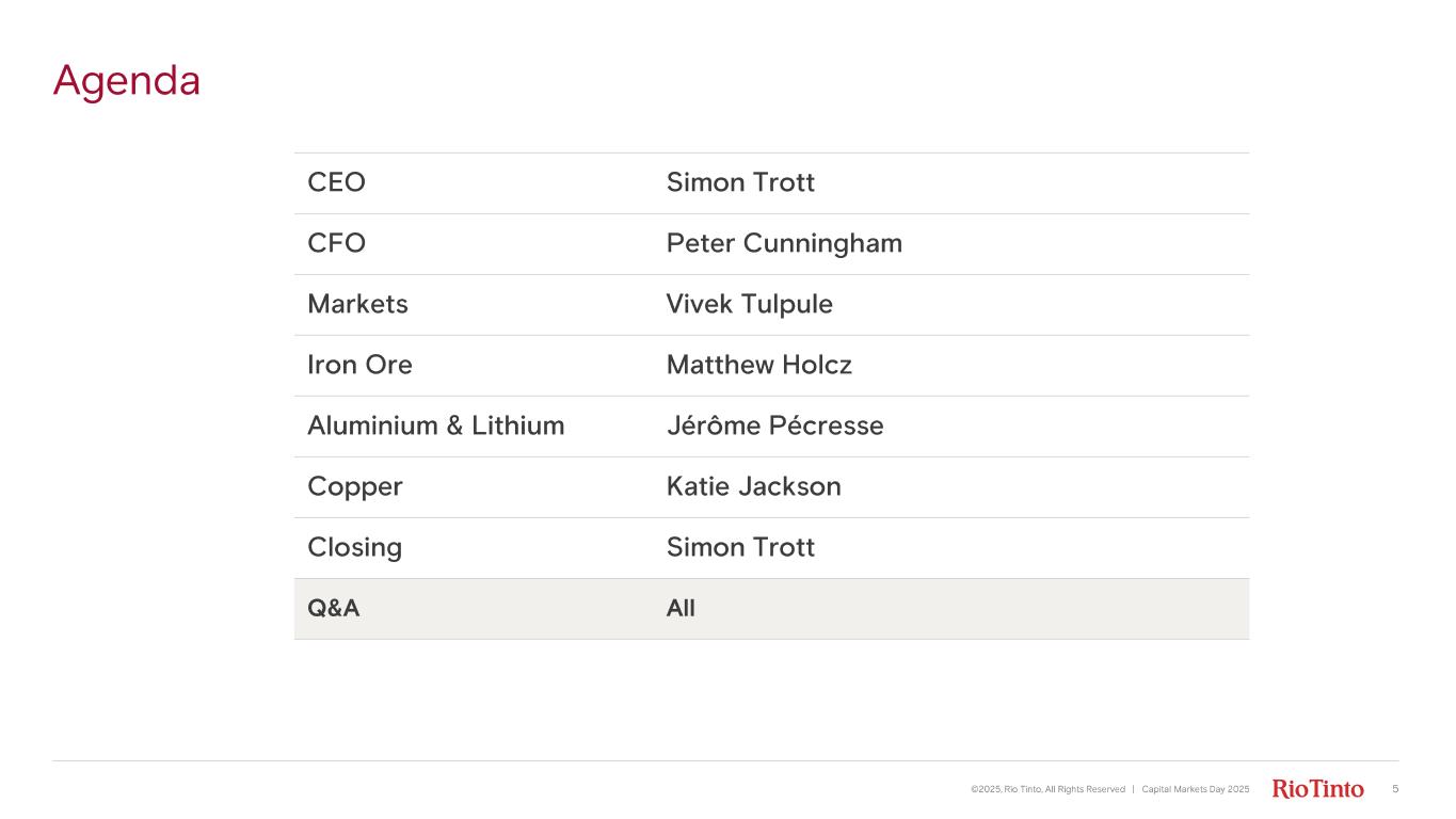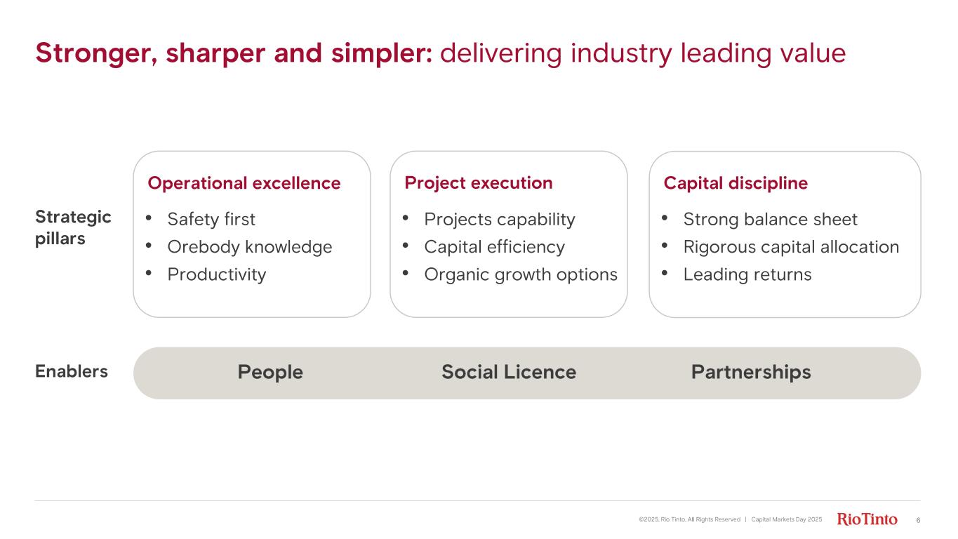 Agenda ©2025, Rio Tinto, All Rights Reserved | Capital Markets Day 2025 5 CEO Simon Trott CFO Peter Cunningham Markets Vivek Tulpule Iron Ore Matthew Holcz Aluminium & Lithium Jérôme Pécresse Copper Katie Jackson Closing Simon Trott Q&A All