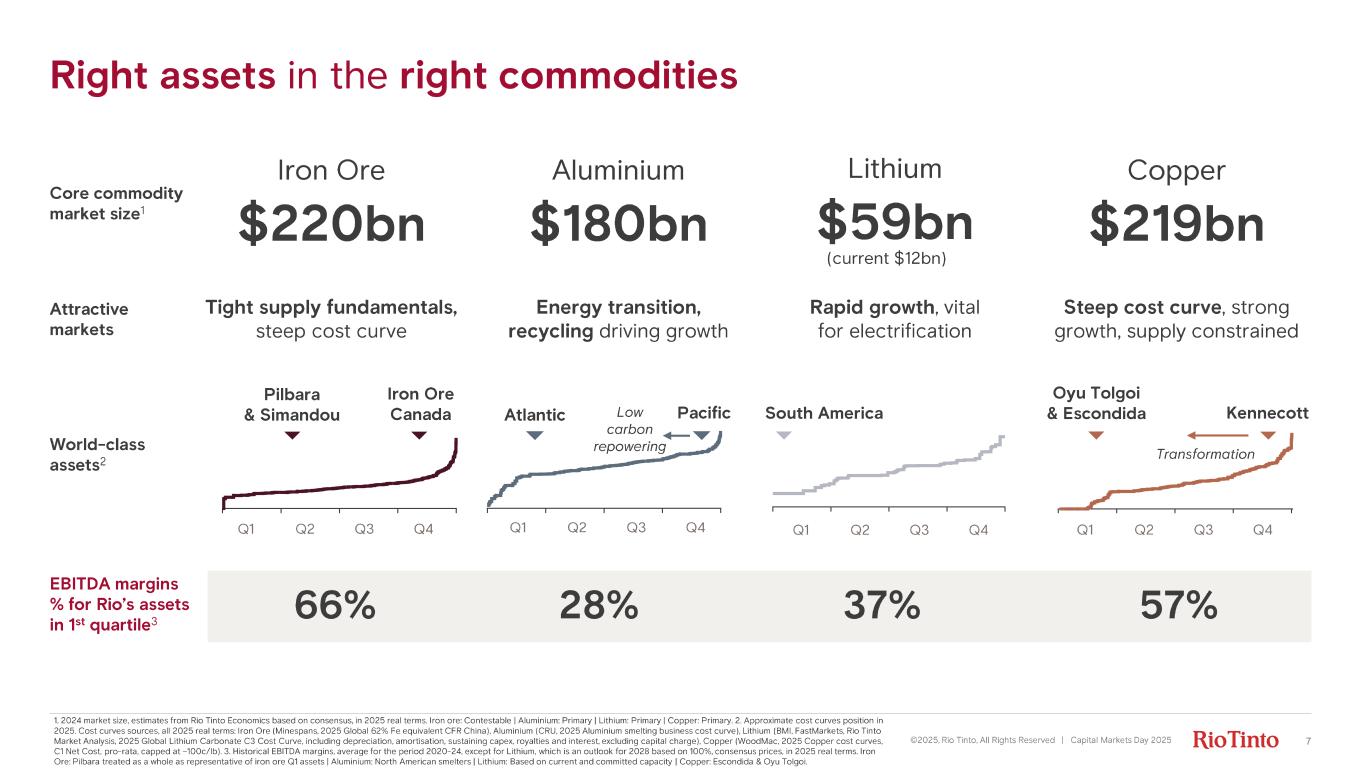 Stronger, sharper and simpler: delivering industry leading value 6©2025, Rio Tinto, All Rights Reserved | Capital Markets Day 2025 • Safety first • Orebody knowledge • Productivity Operational excellence Capital discipline • Strong balance sheet • Rigorous capital allocation • Leading returns • Projects capability • Capital efficiency • Organic growth options Project execution Strategic pillars Enablers People Social Licence Partnerships