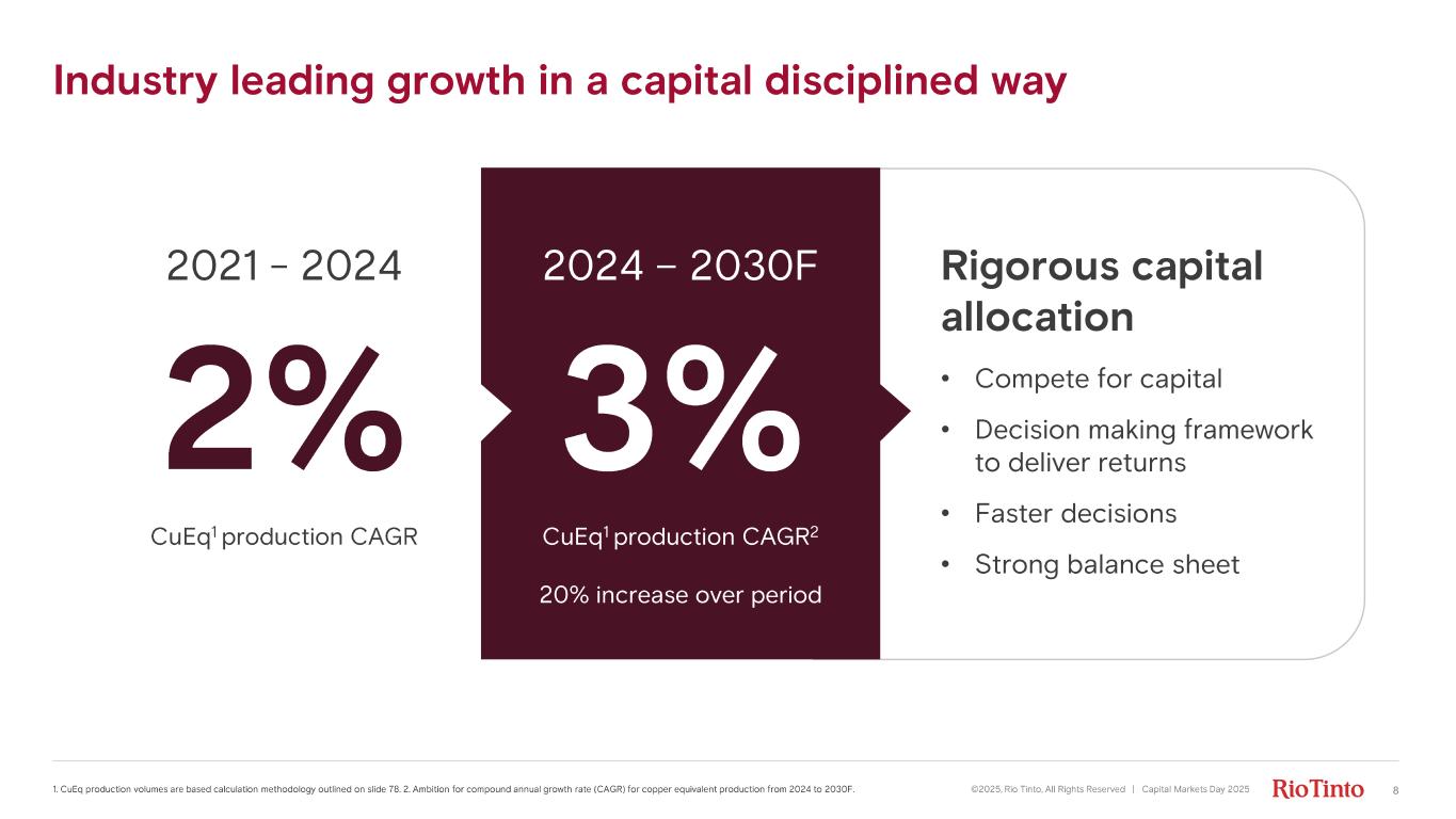 Industry leading growth in a capital disciplined way ©2025, Rio Tinto, All Rights Reserved | Capital Markets Day 2025 81. CuEq production volumes are based calculation methodology outlined on slide 78 . 2. Am bition for compound annual growth rate (CAGR) for copper equivalent production from 2024 to 2030F. Rigorous capital allocation • Compete for capital • Decision making framework to deliver returns • Faster decisions • Strong balance sheet 2% CuEq 1 production C AGR 2021 - 2024 3% CuEq 1 production CAGR 2 20% increase over period 2024 – 2030F