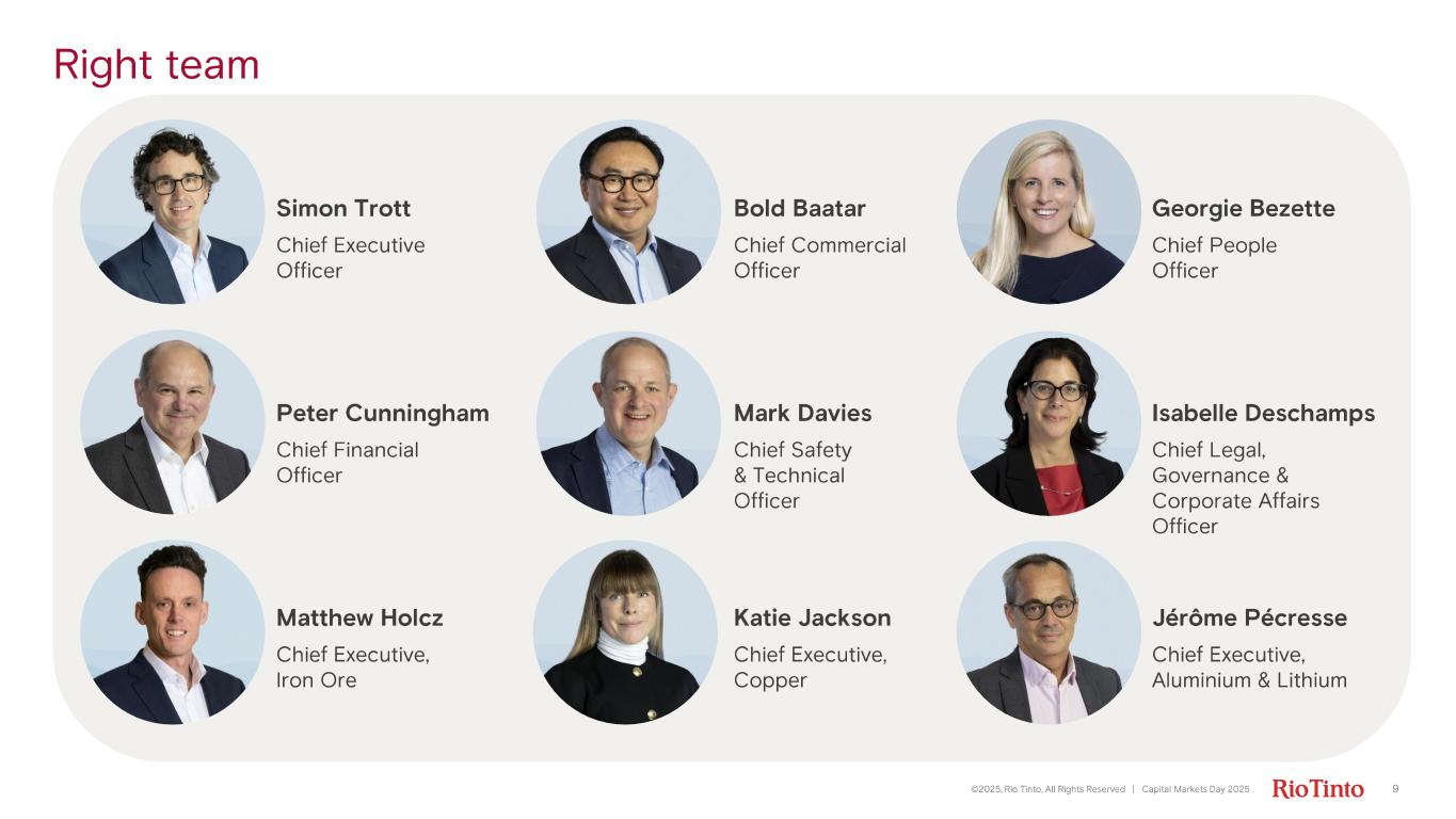 Simon Trott Chief Executive Officer Bold Baatar Chief Commercial Officer Georgie Bezette Chief People Officer Peter Cunningham Chief Financial Officer Mark Davies Chief Safety & Technical Officer Isabelle Deschamps Chief Legal, Governance & Corporate Affairs Officer Matthew Holcz Chief Executive, Iron Ore Katie Jackson Chief Executive, Copper Jérôme Pécresse Chief Executive, Aluminium & Lithium Right team ©2025, Rio Tinto, All Rights Reserved | Capital Markets Day 2025 9