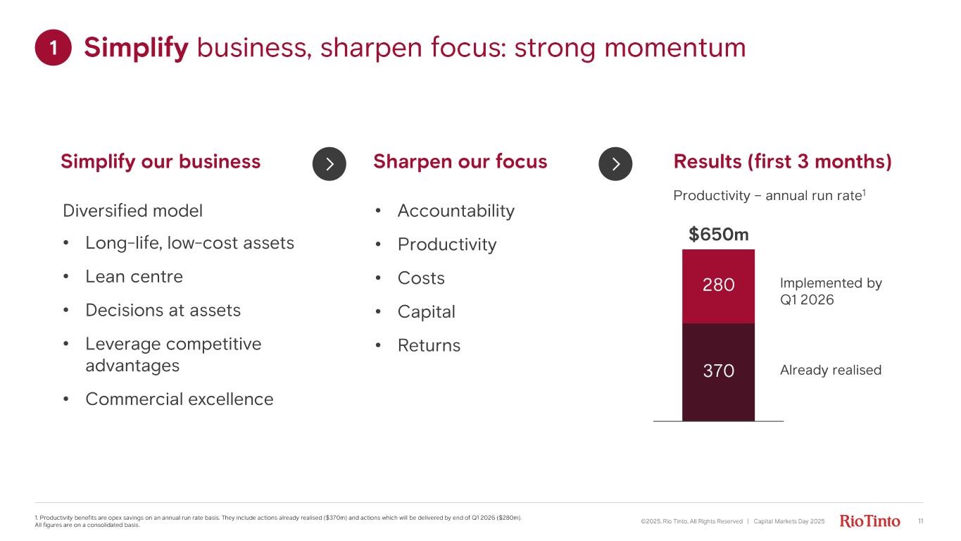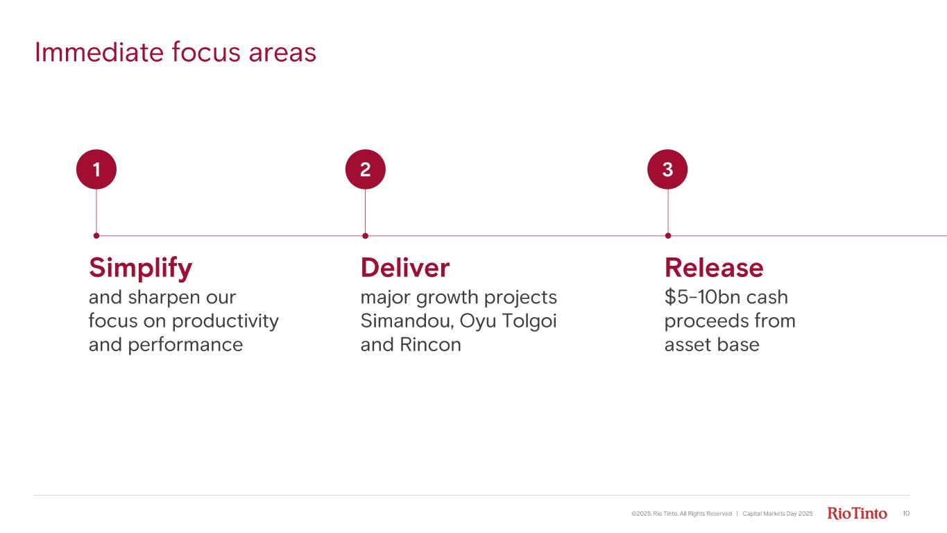 1 Immediate focus areas Simplify and sharpen our focus on productivity and performance Deliver major growth projects Simandou , Oyu Tolgoi and Rincon Release $5 - 10bn cash proceeds from asset base 2 3 ©2025, Rio Tinto, All Rights Reserved | Capital Markets Day 2025 10