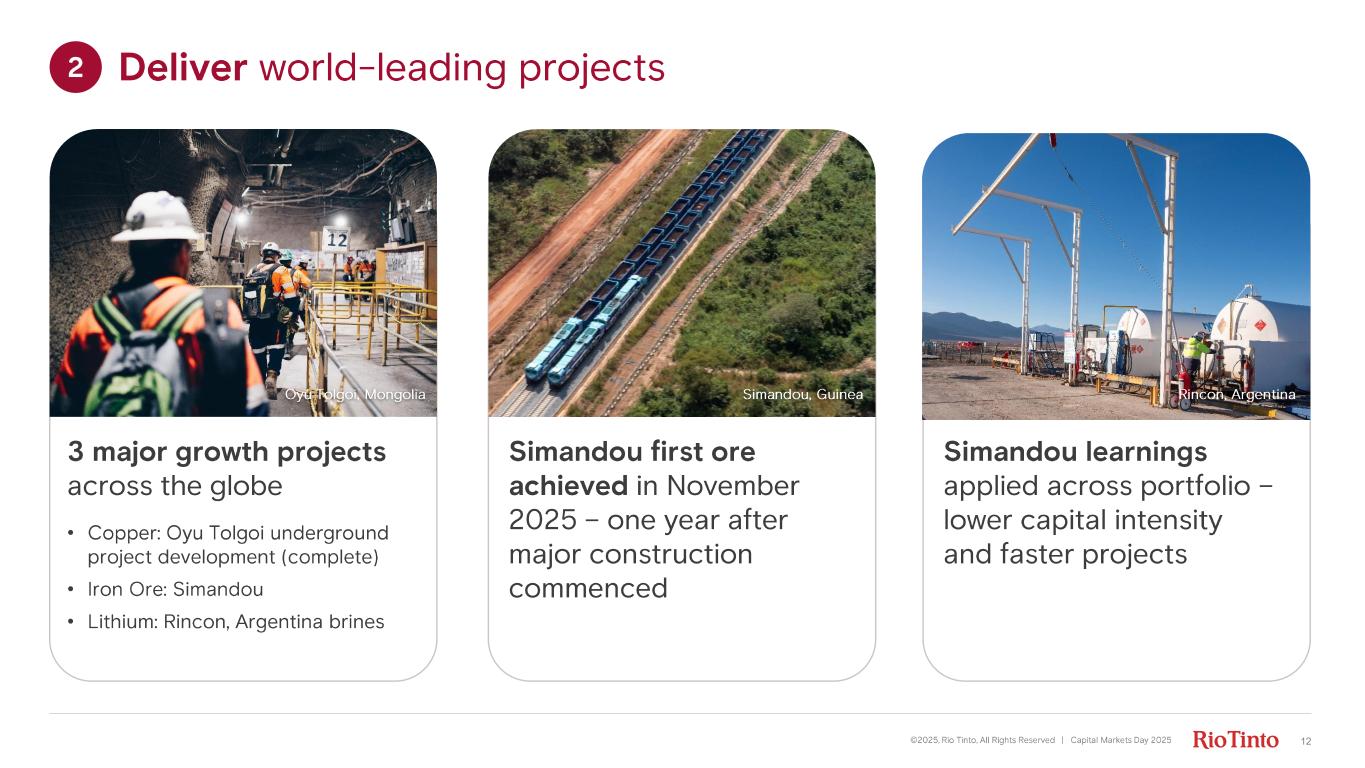 11 1. Productivity benefits are opex savings on an annual run rate basis. They include actions already realised ($370m) and actions which will be delivered by end of Q1 2026 ($280m). All figures are on a consolidated basis. 370 280 $ 650 m Results (first 3 months) • Accountability • Productivity • Costs • Capital • Returns • Long - life, low- cost assets • Lean centre • Decisions at assets • Leverage competitive advantages • Commercial excellence Diversified model Simplify our business Sharpen our focus Productivity – annual run rate 1 Implemented by Q1 2026 Already realised ©2025, Rio Tinto, All Rights Reserved | Capital Markets Day 2025 1 Simplify business, sharpen focus: strong momentum