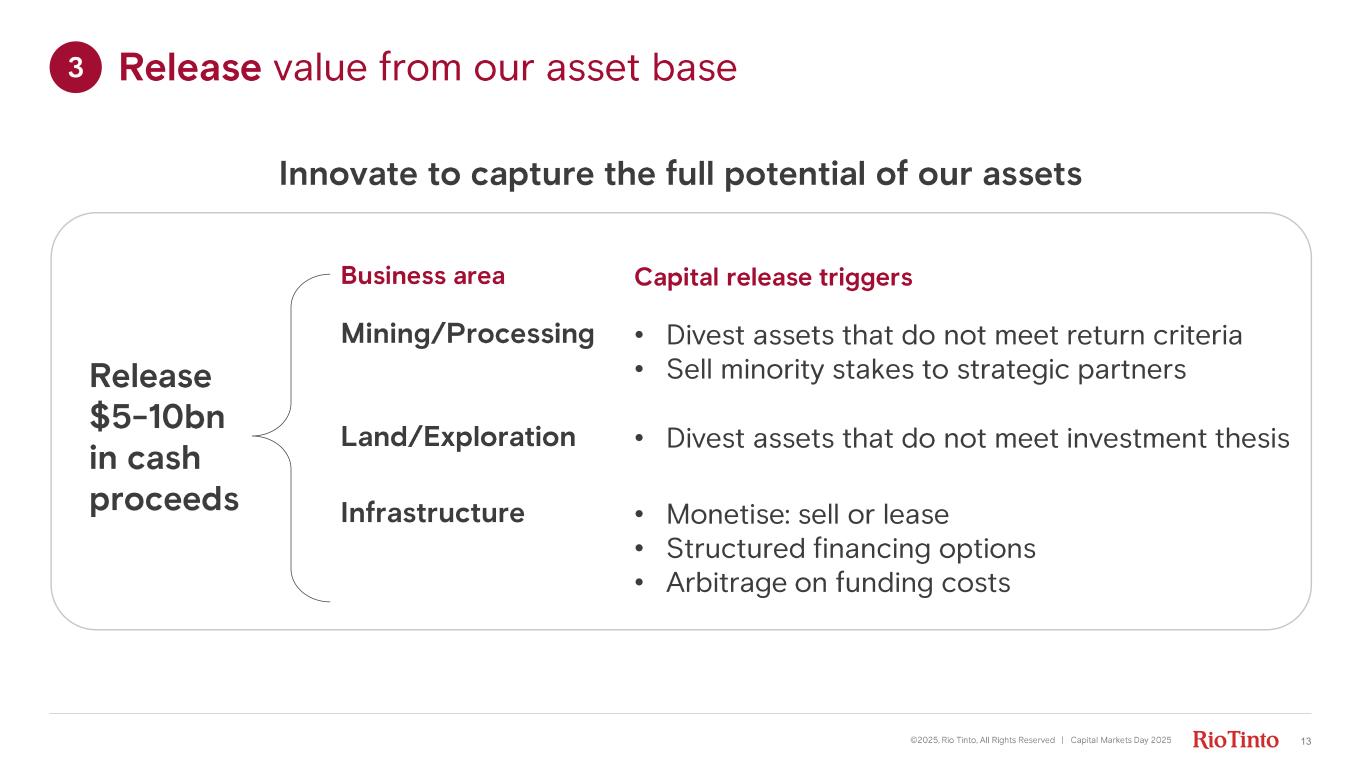 3 major growth projects across the globe • Copper: Oyu Tolgoi underground project development (complete) • Iron Ore: Simandou • Lithium: Rincon, Argentina brines Deliver world - leading projects ©2025, Rio Tinto, All Rights Reserved | Capital Markets Day 2025 12 Simandou learnings applied across portfolio – lower capital intensity and faster projects Simandou first ore achieved in November 2025 – one year after major construction commenced 2 Oyu Tolgoi, Mongolia Simandou, Guinea Rincon, Argentina