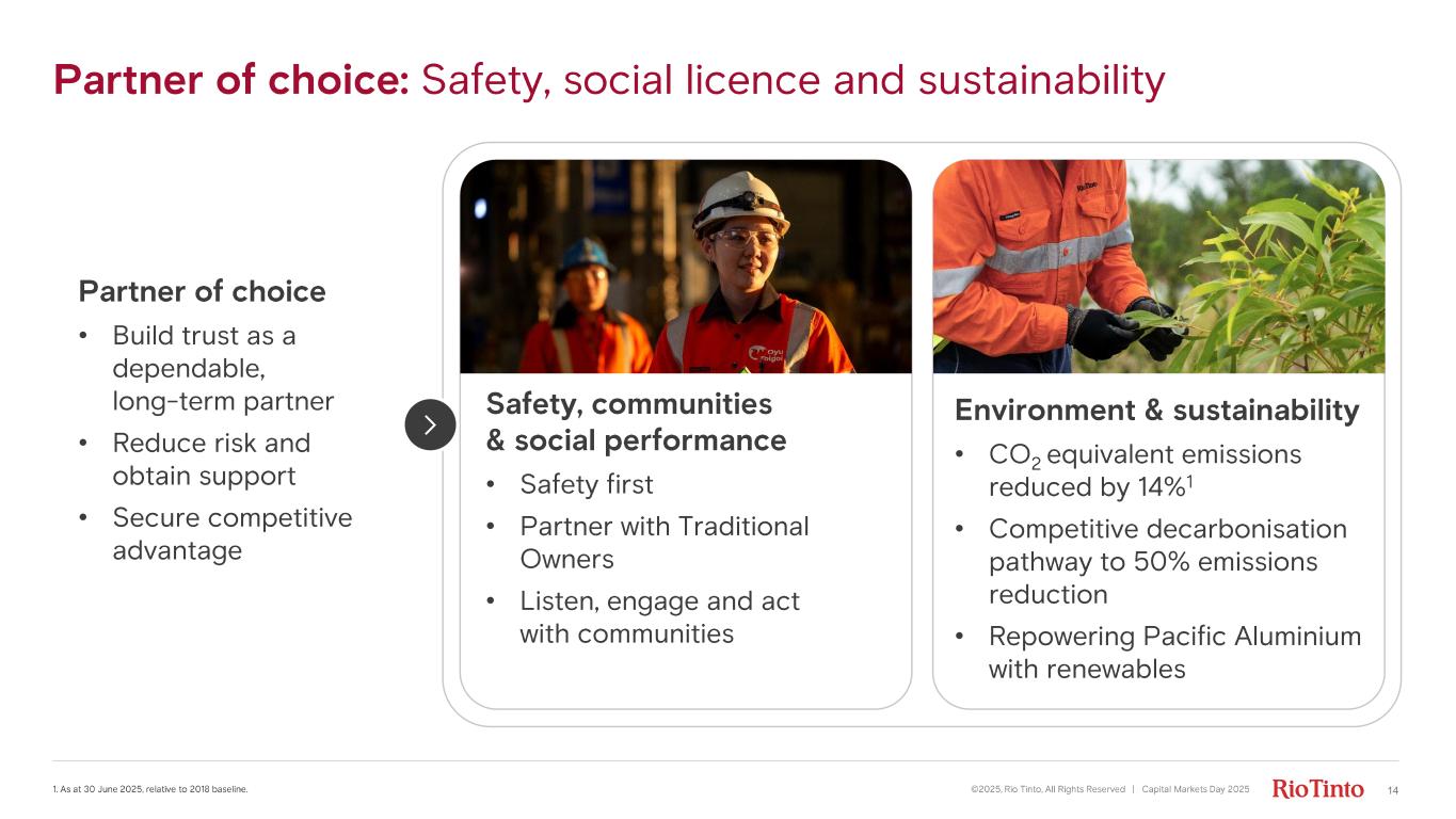 Release value from our asset base ©2025, Rio Tinto, All Rights Reserved | Capital Markets Day 2025 13 Business area Capital release triggers Release $5 - 10bn in cash proceeds Land/Exploration • Divest assets that do not meet investment thesis Infrastructure • Monetise: sell or lease • Structured financing options • Arbitrage on funding costs Mining/Processing • Divest assets that do not meet return criteria • Sell minority stakes to strategic partners 3 Innovate to capture the full potential of our assets