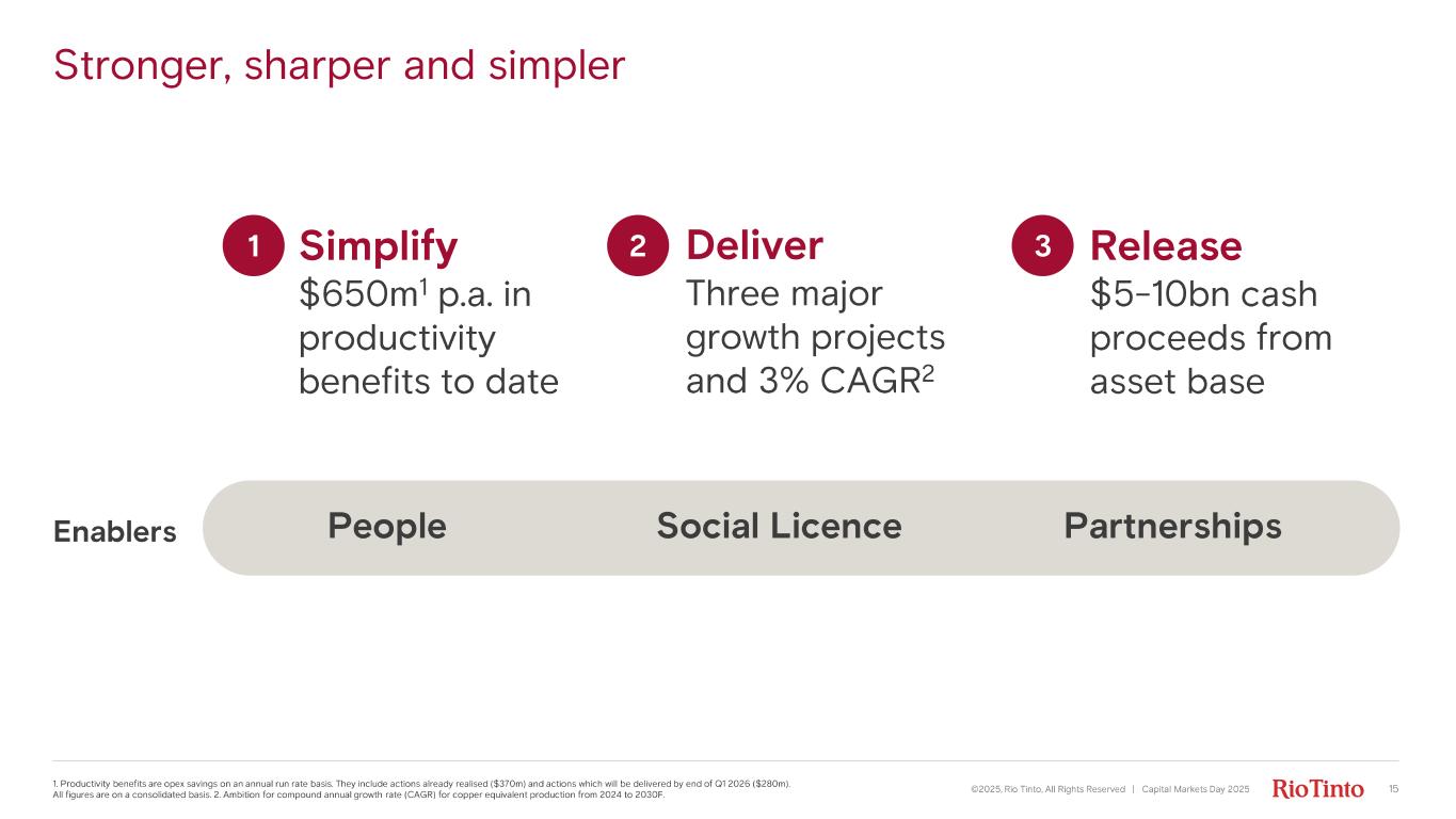 15©2025, Rio Tinto, All Rights Reserved | Capital Markets Day 2025 Simplify $650m 1 p.a. in productivity benefits to date Deliver Three major growth projects and 3% CAGR 2 Release $5 - 10bn cash proceeds from asset base Enablers 1 2 3 People Social Licence Partnerships Stronger, sharper and simpler 1. Productivity benefits are opex savings on an annual run rate basis. They include actions already realised ($370m) and actions which will be delivered by end of Q1 2026 ($280m). All figures are on a consolidated basis. 2. Am bition for compound annual growth rate (CAGR) for copper equivalent production from 2024 to 2030F.