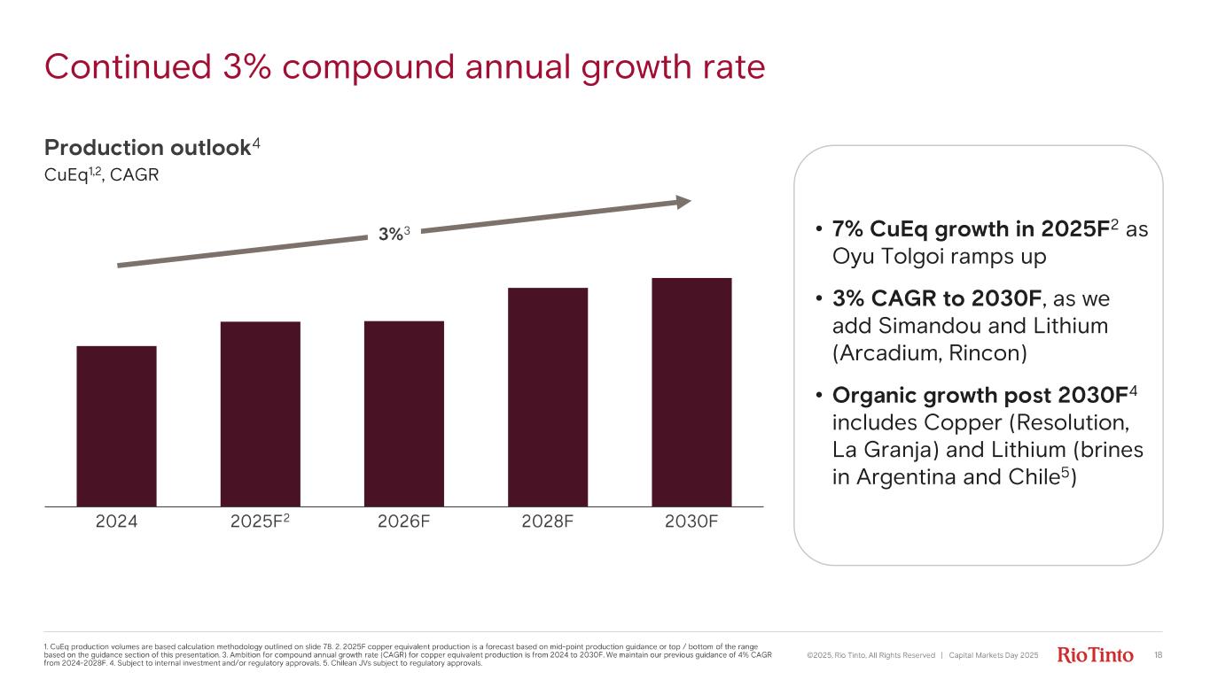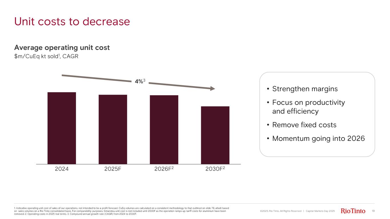 Continued 3% compound annual growth rate 1. CuEq production volumes are based calculation methodology outlined on slide 78 . 2. 2025F copper equivalent production is a forecast based on mid - point production guidance or top / bottom of the range based on the guidance section of this presentation. 3. Am bition for compound annual growth rate (CAGR) for copper equivalent production is from 2024 to 2030F. We maintain our previou s g uidance of 4% CAGR from 2024 - 2028F. 4. Subject to internal investment and/or regulatory approvals. 5. Chilean JVs subject to regulatory approvals. Production outlook 4 CuEq 1,2, CAGR 2024 2025F 2 2026F 2028F 2030 F • 7% CuEq growt h in 2025F 2 as Oyu Tolgoi ramps up • 3% CAGR to 2030F , as we add Simandou and Lithium (Arcadium , Rincon) • Organic g rowth post 2030F 4 includes Copper (Resolution, La Granja) and Lithium (brines in Argentina and Chile 5) ©2025, Rio Tinto, All Rights Reserved | Capital Markets Day 2025 18 3% 3