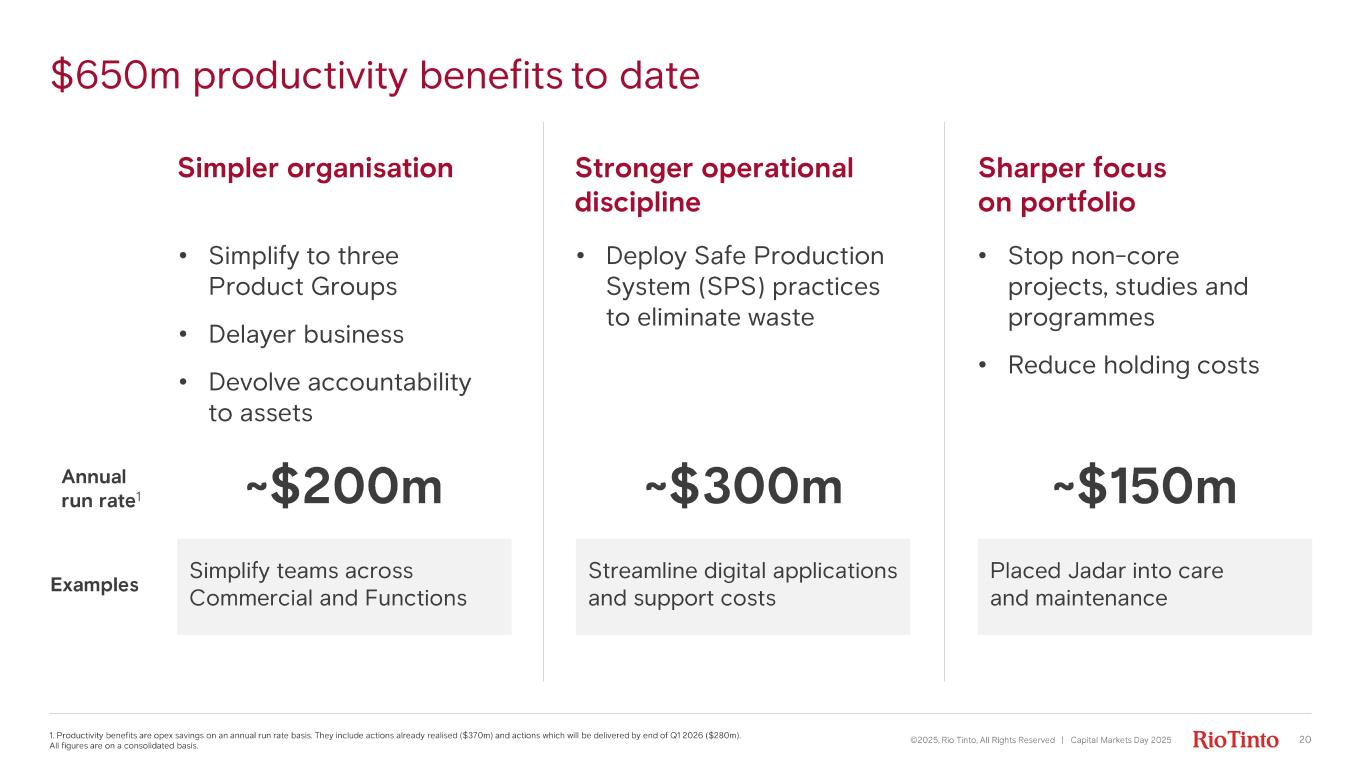 Unit costs to decrease ©2025, Rio Tinto, All Rights Reserved | Capital Markets Day 2025 1. Indicative operating unit cost of sales of our operations, not intended to be a profit forecast. CuEq volumes are calculated on a consistent methodology to that outlined on slide 78, albeit based on sales volumes on a Rio Tinto consolidated basis. For comparability purposes, Simandou unit cost is not included until 2030F as the operation ramps up; tariff costs for alumin ium have been removed. 2. Operating costs in 2025 real terms. 3. C ompound annual growth rate (CAGR) from 2024 to 2030F. Average operating unit cost $ m/ CuEq kt sold 1, CAGR 2024 2025F 2026F 2 2030F 2 19 • Strengthen margins • Focus on productivity and efficiency • Remove fixed costs • Momentum going into 2026 4% 3