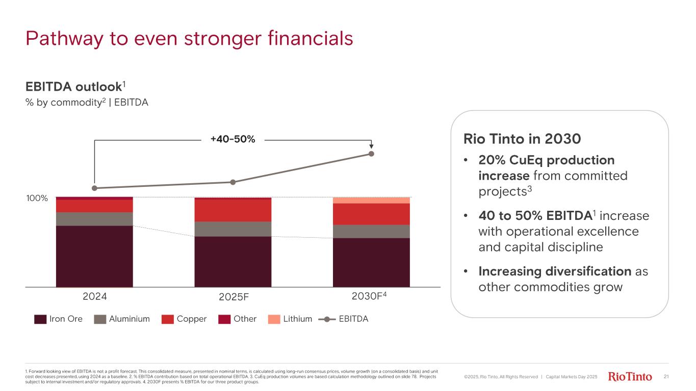 $650m productivity benefits to date 1. Productivity benefits are opex savings on an annual run rate basis. They include actions already realised ($370m) and actions which will be delivered by end of Q1 2026 ($280m). All figures are on a consolidated basis. Stronger operational discipline Sharper focus on portfolio Simpler organisation ~$300m ~$150m~$200m Simplify teams across Commercial and Functions Streamline digital applications and support costs Placed Jadar into care and maintenance Examples Annual run rate 1 ©2025, Rio Tinto, All Rights Reserved | Capital Markets Day 2025 20 • Simplify to three Product Groups • Delayer business • Devolve accountability to assets • Deploy Safe Production System (SPS) practices to eliminate waste • Stop non - core projects, studies and programmes • Reduce holding costs