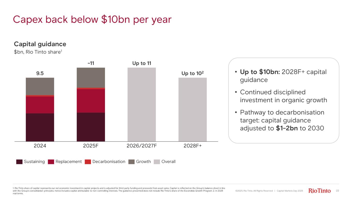 Capex back below $10bn per year 2024 2025F 2026/2027F 2028F+ 9.5 ~11 Up to 11 Up to 10 2 Capital guidance $bn, Rio Tinto share 1 • Up to $10bn: 2028F+ capital guidance • Continued disciplined investment in organic growth • Pathway to decarbonisation target : capital guidance adjusted to $1- 2bn to 2030 Sustaining Replacement Decarbonisation Growth Overall ©2025, Rio Tinto, All Rights Reserved | Capital Markets Day 2025 1. Rio Tinto share of capital represents our net economic investment in capital projects and is adjusted for third party fund ing and proceeds from asset sales. Capital is reflected on the Group’s balance sheet in line with the Group’s consolidation principles, hence includes capital attributable to non - controlling interests. The guidance presen ted does not include Rio Tinto’s share of the Escondida Growth Program. 2. In 2025 real terms. 22