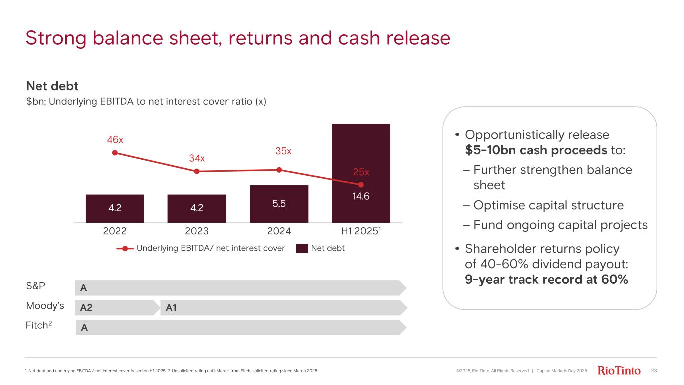 Strong balance sheet, returns and cash release ©2025, Rio Tinto, All Rights Reserved | Capital Markets Day 2025 Net debt $bn; Underlying EBITDA to net interest cover ratio (x) 4.2 4.2 5.5 46 x 2022 34x 2023 35 x 2024 14.6 25x H1 2025 1 Underlying EBITDA/ net interest cover Net debt A A1A2 S&P Moody’s 1. Net debt and underlying EBITDA / net interest cover based on H1 2025. 2. Unsolicited rating until March from Fitch, solici ted rating since March 2025. Fitch 2 A • Opportunistically release $5 - 10bn cash proceeds to: – Further strengthen balance sheet – Optimise capital structure – Fund ongoing capital projects • Shareholder returns policy of 40 - 60% dividend payout: 9 - year track record at 60% 23