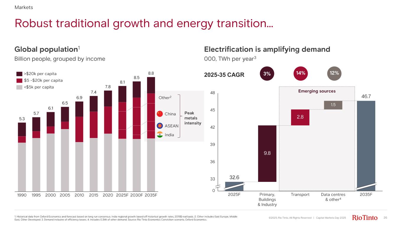 Robust traditional growth and energy transition... 1. Historical data from Oxford Economics and forecast based on long run consensus. India regional growth based off historical gr owth rates, 2015$ real basis. 2. Other includes East Europe, Middle East, Other Developed. 3. Demand inclusive of efficiency losses. 4. Includes 0.3Mt of other demand. Source: Rio Tinto Economi cs Conviction scenario, Oxford Economics. Peak metals intensity Global population 1 Billion people, grouped by income Electrification is amplifying demand 000, TWh per year 3 1990 1995 2000 2005 2010 2015 2020 2025F 2030F 2035F 5.3 5.7 6.1 6.5 6.9 7.4 7.8 8.1 8.5 8.8>$20k per capita $5 - $20k per capita <$5k per capita Emerging sources 2025-35 CAGR 12%3% 14% 0 33 36 39 42 45 48 2025F 9.8 Primary, Buildings & Industry 2.8 Transport 1.5 Data centres & other 4 2035F 32.6 46.7 China ASEAN India Other 2 26©2025, Rio Tinto, All Rights Reserved | Capital Markets Day 2025 Markets