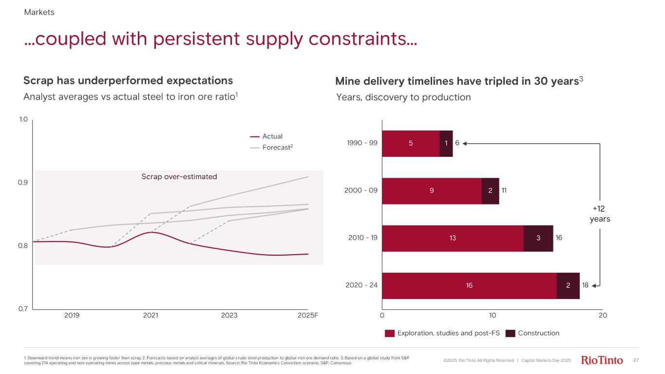 Scrap over - estimated …coupled with persistent supply constraints… ©2025, Rio Tinto, All Rights Reserved | Capital Markets Day 2025 27 1. Downward trend means iron ore is growing faster than scrap 2. Forecasts based on analyst averages of global crude steel pr odu ction to global iron ore demand ratio. 3. Based on a global study from S&P covering 214 operating and non - operating mines across base metals, precious metals and critical minerals. Source: Rio Tinto Economics Conviction scenario, S&P, Consensus Analyst averages vs actual s teel to iron ore ratio 1 Scrap has underperformed expectations Mine delivery timelines have tripled in 30 years 3 Years, discovery to production Actual Forecast 2 5 9 13 16 1 2 3 2 0 10 20 1990 - 99 2000 - 09 2010 - 19 2020 - 24 6 11 16 18 +12 years Exploration, studies and post - FS Construction 0.7 0.8 0.9 1.0 2019 2021 2023 2025F Markets