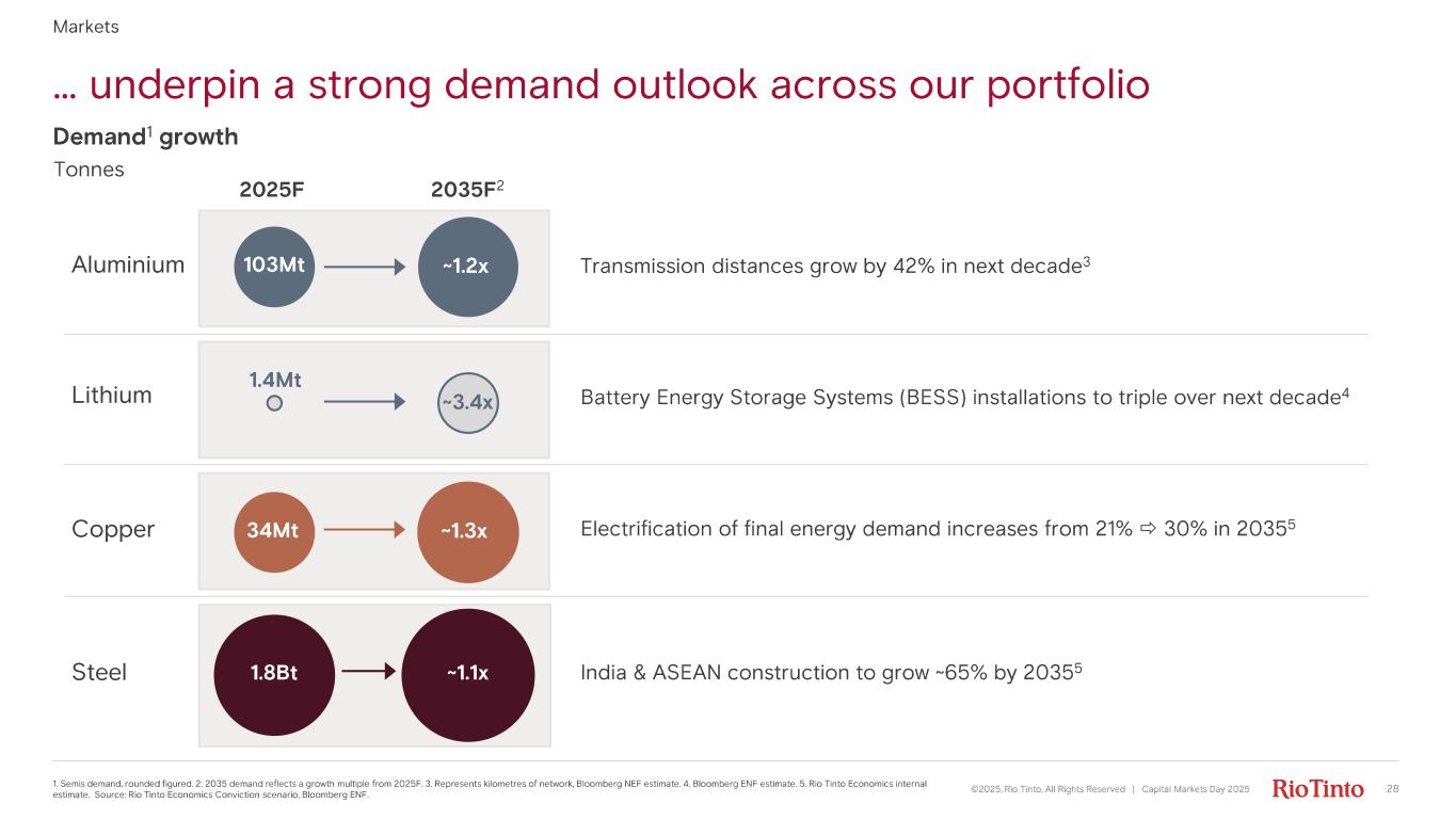 … underpin a strong demand outlook across our portfolio ©2025, Rio Tinto, All Rights Reserved | Capital Markets Day 2025 1. Semis demand, rounded figured. 2. 2035 demand reflects a growth multiple from 2025F. 3. Represents kilometres of network, Blo omberg NEF estimate. 4. Bloomberg ENF estimate. 5. Rio Tinto Economics internal estimate. Source: Rio Tinto Economics Conviction scenario, Bloomberg ENF. Markets 28 2025F 2035F 2 Demand 1 growth Tonnes Transmission distances grow by 42% in next decade 3 Battery Energy Storage Systems (BESS) installations to triple over next decade 4 Electrification of final energy demand increases from 21%  30% in 2035 5 India & ASEAN construction to grow ~65% by 2035 5 Aluminium Lithium Copper Steel 103Mt 1.4Mt 1.8Bt ~1.2x ~3.4x ~1.1x ~1.3x34Mt