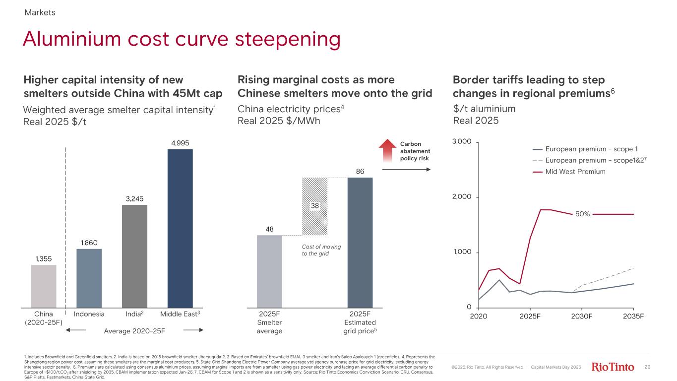 48 86 2025F Smelter average 38 2025F Estimated grid price 5 Aluminium cost curve steepening Higher capital intensity of new smelters outside China with 45Mt cap China electricity prices 4 Real 2025 $/MWh Weighted average smelter capital intensity 1 Real 2025 $/t Rising marginal costs as more Chinese smelters move onto the grid Border tariffs leading to step changes in regional premiums 6 $/t aluminium Real 2025 Carbon abatement policy risk Cost of moving to the grid 0 1,000 2,000 3,000 2020 2025 F 2030 F 2035 F European premium - scope 1 European premium - scope1&2 7 Mid West Premium 50% 1. Includes Brownfield and Greenfield smelters. 2. India is based on 2015 brownfield smelter Jharsuguda 2. 3. Based on Emirates’ brownfield EMAL 3 smelter and Iran’s Salco Asalouyeh 1 (greenfield). 4 . Represents the Shangdong region power cost, assuming these smelters are the marginal cost producers. 5. State Grid Shandong Electric Power Company average ytd agency purchase price for grid electricity, excluding energy intensive sector penalty. 6. Premiums are calculated using consensus aluminium prices, assuming marginal imports are from a smelter using gas power electr ici ty and facing an average differential carbon penalty to Europe of ~$100/t.CO 2 after shielding by 2035. CBAM implementation expected Jan - 26. 7. CBAM for Scope 1 and 2 is shown as a sensitivity only. Source: Rio Tinto Economics Conviction Scenario, CRU, Consensus, S&P Platts, Fastmarkets , China State Grid. 1,355 1,860 3,245 4,995 China (2020 - 25F) Indonesia India 2 Middle East 3 Average 2020 - 25F 29©2025, Rio Tinto, All Rights Reserved | Capital Markets Day 2025 Markets