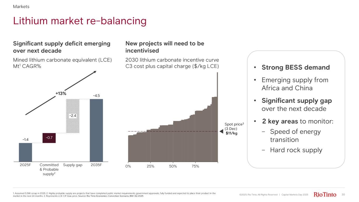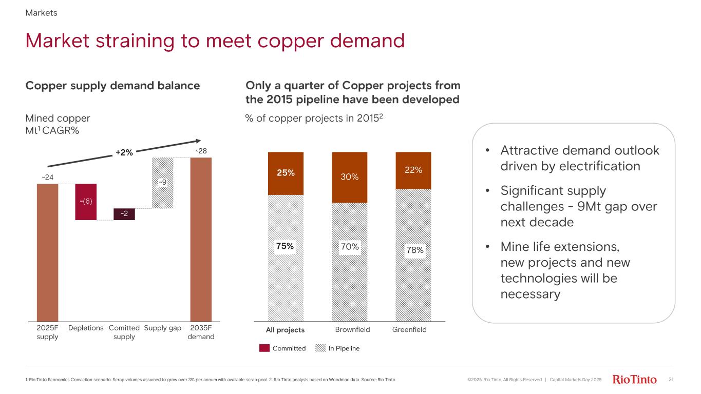 • Strong BESS demand • Emerging supply from Africa and China • S ignificant supply gap over the next decade • 2 key areas to monitor: – S peed of energy transition – Hard rock supply Lithium market re - balancing ©2025, Rio Tinto, All Rights Reserved | Capital Markets Day 2025 30 1. Assumed 0.2Mt scrap in 2035. 2. Highly probable supply are projects that have completed public market requirements, govern men t approvals, fully funded and expected to place their product in the market in the next 24 months. 3. Represents LCE CIF Asia price. Source: Rio Tinto Economics Conviction Scenario, BMI 3Q 2025 Significant supply deficit emerging over next decade 2030 lithium carbonate incentive curve C3 cost plus capital charge ($ /kg LCE) Mined lithium carbonate equivalent (LCE) Mt1 CAGR% New projects will need to be incentivised 2025F ~0.7 Committed & Probable supply 2 ~2.4 Supply gap 2035F ~1.4 ~4.5 +13% 0% 25% 75%50% Spot price 3 (3 Dec) $11/kg Markets