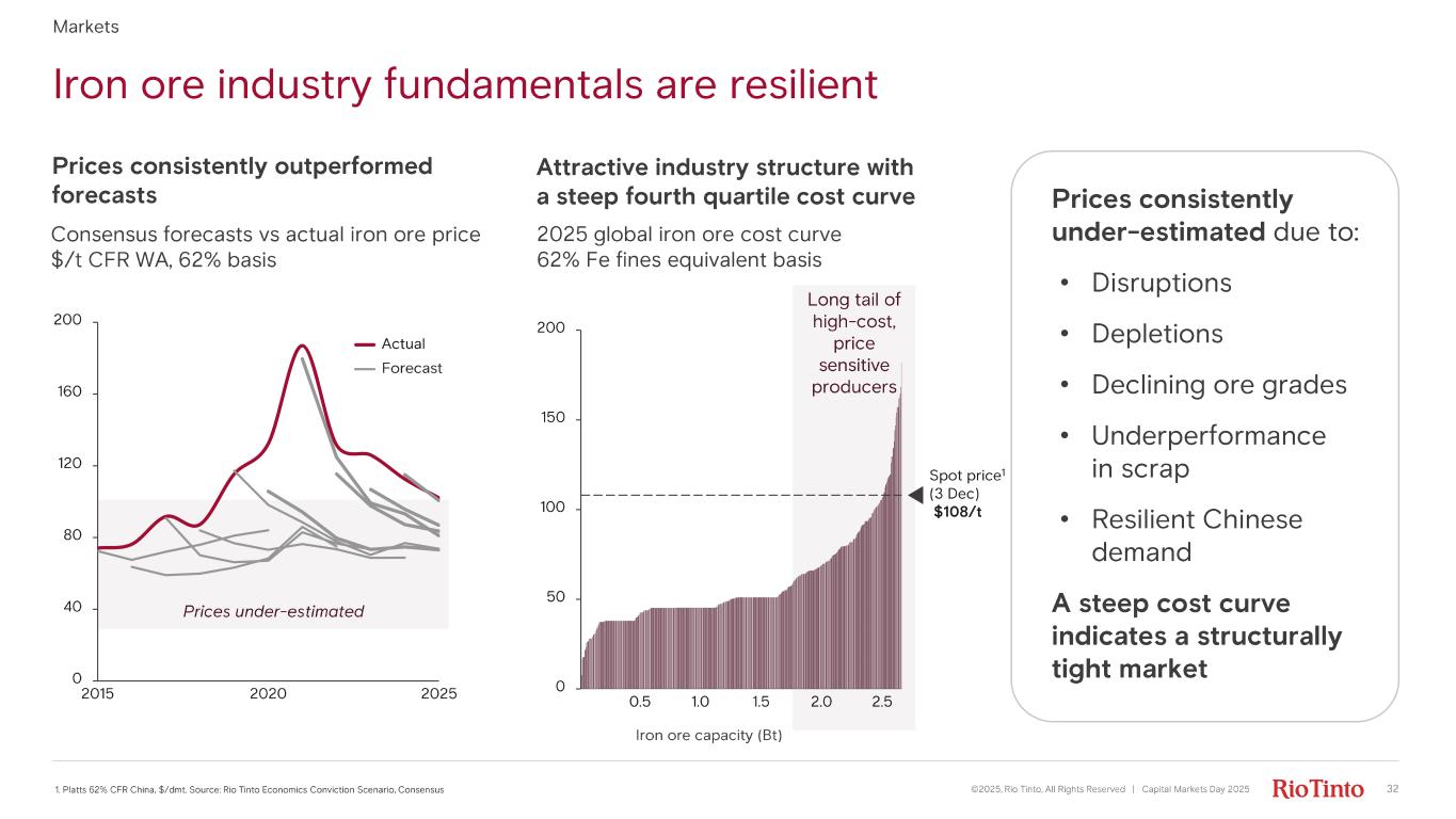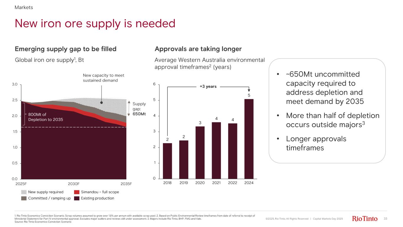 Markets Prices under - estimated Consensus forecasts vs actual iron ore price $/t CFR WA, 62% basis Long tail of high - cost, price sensitive producers Prices consistently outperformed forecasts Prices consistently under - estimated due to: • Disruptions • Depletions • Declining ore grades • Underperformance in scrap • Resilient Chinese demand A steep cost curve indicates a structurally tight market 1. Platts 62% CFR China, $/ dmt. S ource : Rio Tinto Economics Conviction Scenario, Consensus Iron ore capacity ( Bt ) 2025 global iron ore cost curve 62% Fe fines equivalent basis Attractive industry structure with a steep fourth quartile cost curve 0 50 100 150 200 0.5 1.0 1.5 2.0 2.5 Spot price 1 (3 Dec) $108/ t ©2025, Rio Tinto, All Rights Reserved | Capital Markets Day 2025 32 Iron ore industry fundamentals are resilient 0 40 80 120 160 200 2015 2020 2025 Actual Forecast