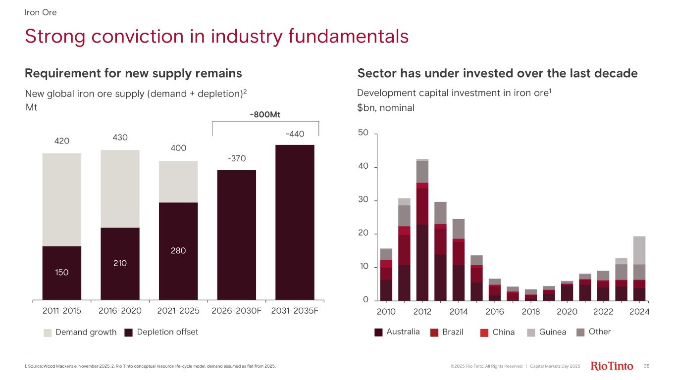 Mt Strong conviction in industry fundamentals ©2025, Rio Tinto, All Rights Reserved | Capital Markets Day 2025 381. Source: Wood Mackenzie, November 2025. 2. Rio Tinto conceptual resource life - cycle model, demand assumed as flat from 2025. 150 210 280 420 430 400 ~370 ~440 2011-2015 2016-2020 2021-2025 2026-2030F 2031-2035F Demand growth Requirement for new supply remains Depletion offset New global iron ore supply (demand + depletion) 2 Iron Ore Development capital investment in iron ore 1 Australia Brazil China OtherGuinea $bn, nominal Sector has under invested over the last decade 0 10 20 30 40 50 2010 2012 2014 2016 2018 2020 2022 2024 ~800Mt