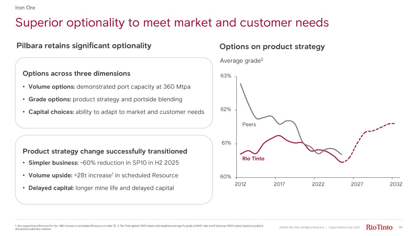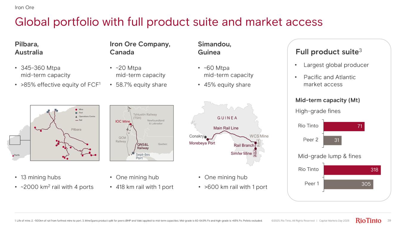 318 305 Rio Tinto Peer 1 Mid- term capacity (Mt) Global portfolio with full product suite and market access ©2025, Rio Tinto, All Rights Reserved | Capital Markets Day 2025 391. Life of mine. 2. ~500km of rail from furthest mine to port. 3. MineSpans product split for peers (BHP and Vale) applied to mid - term capacities. M id- grade is 60 - 64.9% Fe and high - grade is >65% Fe. Pellets excluded. Iron Ore Pilbara, Australia Iron Ore Company, Canada Simandou , Guinea • 345 - 360 Mtpa mid- term capacity • >85% effective equity of FCF 1 • ~20 Mtpa mid- term capacity • 58.7% equity share • ~60 Mtpa mid- term capacity • 45% equity share • 13 mining hubs • ~2000 km 2 rail with 4 ports • One mining hub • 418 km rail with 1 port • One mining hub • >600 km rail with 1 port Full product suite 3 • Largest global producer • Pacific and Atlantic market access High - grade fines Mid- grade lump & fines 71 31 Rio Tinto Peer 2