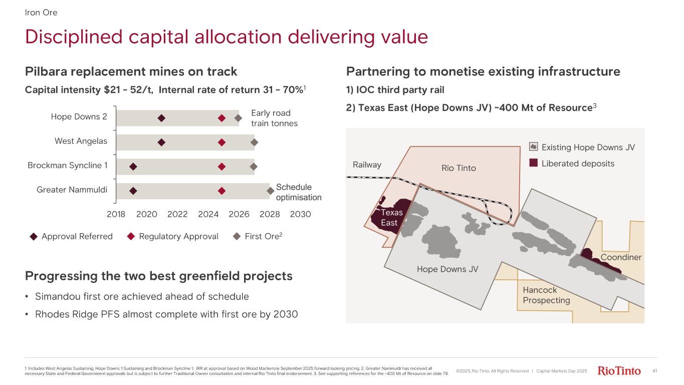 Options across three dimensions • Volume options: demonstrated port capacity at 360 Mtpa • Grade options : product strategy and portside blending • Capital choices: ability to adapt to market and customer needs Product strategy change successfully transitioned • Simpler business: ~60% reduction in SP10 in H2 2025 • Volume upside: +2Bt increase 1 in scheduled Resource • Delayed capital: longer mine life and delayed capital Superior optionality to meet market and customer needs ©2025, Rio Tinto, All Rights Reserved | Capital Markets Day 2025 40 1. See supporting references for the +2Bt increase in scheduled Resource on slide 78. 2. Rio Tinto global (100% basis) and w eig hted average Fe grade of BHP, Vale and Fortescue (100% basis) based on publicly disclosed production volumes. Iron Ore Pilbara retains significant optionality Options on product strategy 60% 61% 62% 63% 2012 2017 2022 2027 2032 Average grade 2 Peers Rio Tinto