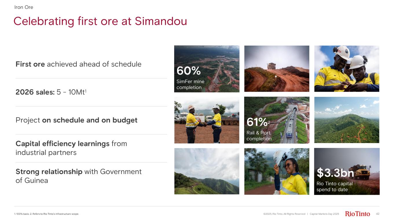 Liberated deposits Disciplined capital allocation delivering value ©2025, Rio Tinto, All Rights Reserved | Capital Markets Day 2025 41 1. Includes West Angelas Sustaining, Hope Downs 1 Sustaining and Brockman Syncline 1; IRR at approval based on Wood Mackenzi e S eptember 2025 forward looking pricing. 2. Greater Nammuldi has received all necessary State and Federal Government approvals but is subject to further Traditional Owner consultation and internal Rio Ti nto final endorsement. 3. See supporting references for the ~400 Mt of Resource on slide 78. Iron Ore Existing Hope Downs JV 2018 2020 2022 2024 2026 2028 2030 Greater Nammuldi Brockman Syncline 1 West Angelas Hope Downs 2 Approval Referred Regulatory Approval Early road train tonnes Schedule optimisation First Ore 2 Rio Tinto Hope Downs JV Hancock Prospecting Pilbara replacement mines on track Capital intensity $21 - 52/t, Internal rate of return 31 - 70% 1 Partnering to monetise existing infrastructure Railway 2) Texas East (Hope Downs JV) ~400 Mt of Resource 3 Progressing the two best greenfield projects • Simandou first ore achieved ahead of schedule • Rhodes Ridge PFS almost complete with first ore by 2030 1) IOC third party rail Texas East Coondiner