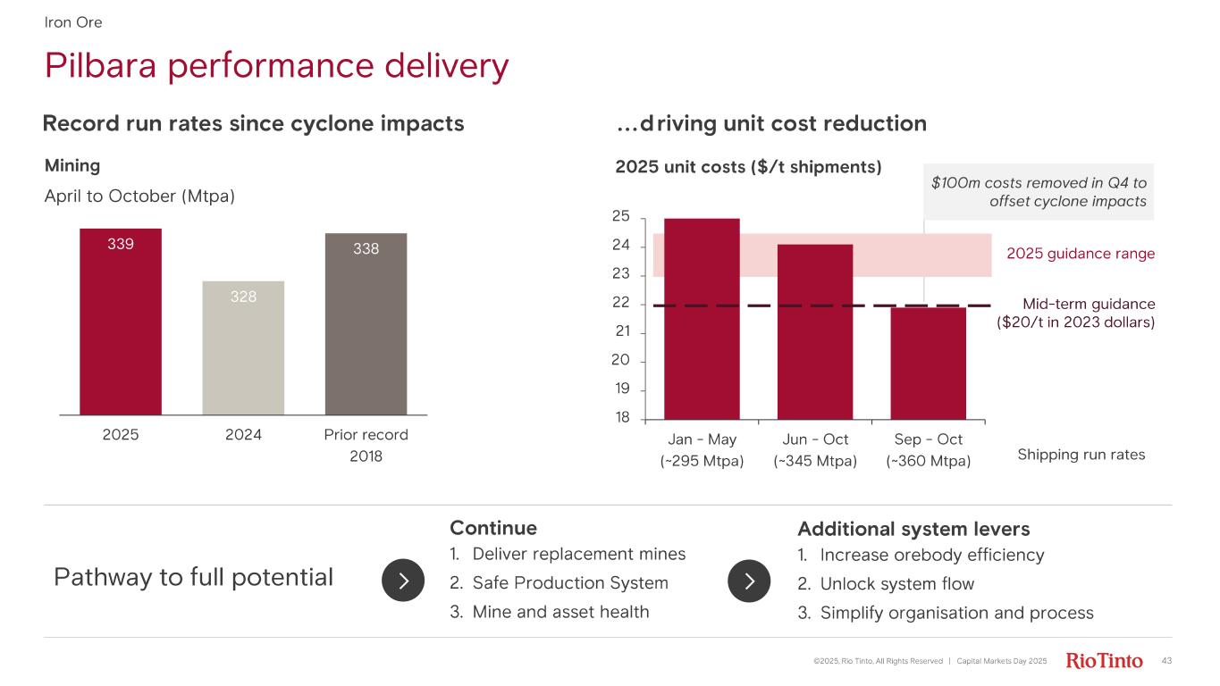 Pilbara performance delivery ©2025, Rio Tinto, All Rights Reserved | Capital Markets Day 2025 43 Iron Ore Mining Record run rates since cyclone impacts April to October (Mtpa) 339 328 338 2025 2024 Prior record 2018 ...d riving unit cost reduction 18 19 20 21 22 23 24 25 Jan - May (~295 Mtpa) Jun - Oct (~345 Mtpa) Sep - Oct (~360 Mtpa) 2025 unit costs ($/t shipments) 2025 guidance range Mid- term guidance ($20/t in 2023 dollars) $100m costs removed in Q4 to offset cyclone impacts 1. Deliver replacement mines 2. Safe Production System 3. Mine and asset health 1. Increase o rebody efficiency 2. Unlock system flow 3. Simplify organisation and process Continue Additional system levers Pathway to full potential Shipping run rates