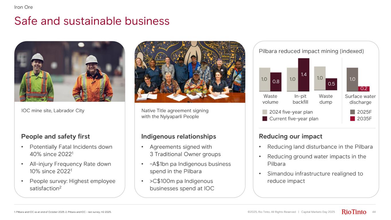 Safe and sustainable business 441. Pilbara and IOC as at end of October 2025. 2. Pilbara and IOC – last survey, H2 2025. Iron Ore ©2025, Rio Tinto, All Rights Reserved | Capital Markets Day 2025 Reducing our impact • Reducing land disturbance in the Pilbara • Reducing ground water impacts in the Pilbara • Simandou infrastructure realigned to reduce impact People and safety first • Potentially Fatal Incidents down 40% since 2022 1 • All- injury Frequency Rate down 10% since 2022 1 • People survey: Highest employee satisfaction 2 Indigenous relationships • Agreements signed with 3 Traditional Owner groups • ~A$1bn pa Indigenous business spend in the Pilbara • >C$100m pa Indigenous businesses spend at IOC 2024 five - year plan Current five - year plan Waste volume In- pit backfill Waste dump 2025F 2035F Surface water discharge 1.0 0.2 1.0 0.5 1.0 1.4 1.0 0.8 Native Title agreement signing with the Nyiyaparli People IOC mine site, Labrador City Pilbara reduced impact mining (indexed)