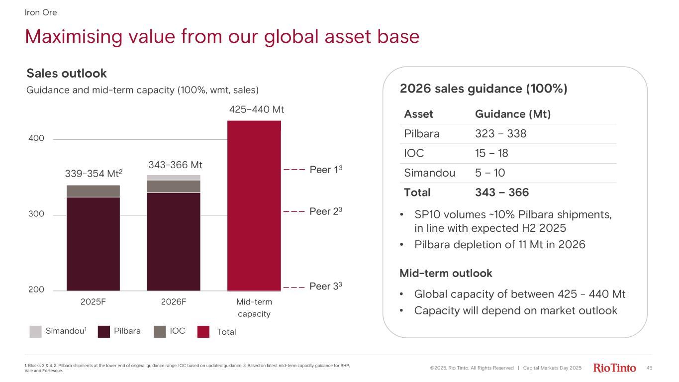 Maximising value from our global asset base ©2025, Rio Tinto, All Rights Reserved | Capital Markets Day 2025 45 1. Blocks 3 & 4. 2. Pilbara shipments at the lower end of original guidance range, IOC based on updated guidance. 3. Based on latest mid - term capacity guidance for BHP, Vale and Fortescue. Iron Ore Needs the catchy investor line to go here Our value proposition 200 300 400 2025F 2026F Mid-term capacity Sales outlook Guidance and mid - term capacity (100%, wmt, sales) Pilbara IOCSimandou 1 Total 339 - 354 Mt 2 425 –440 Mt 343 - 366 Mt Asset Guidance (Mt) Pilbara 323 – 338 IOC 15 – 18 Simandou 5 – 10 Total 343 – 366 2026 sales guidance (100%) Mid- term outlook • SP10 volumes ~10% Pilbara shipments, in line with expected H2 2025 • Pilbara depletion of 11 Mt in 2026 • Global capacity of between 425 - 440 Mt • Capacity will depend on market outlook Peer 13 Peer 23 Peer 33 ©2025, Rio Tinto, All Rights Reserved | Capital Markets Day 2025