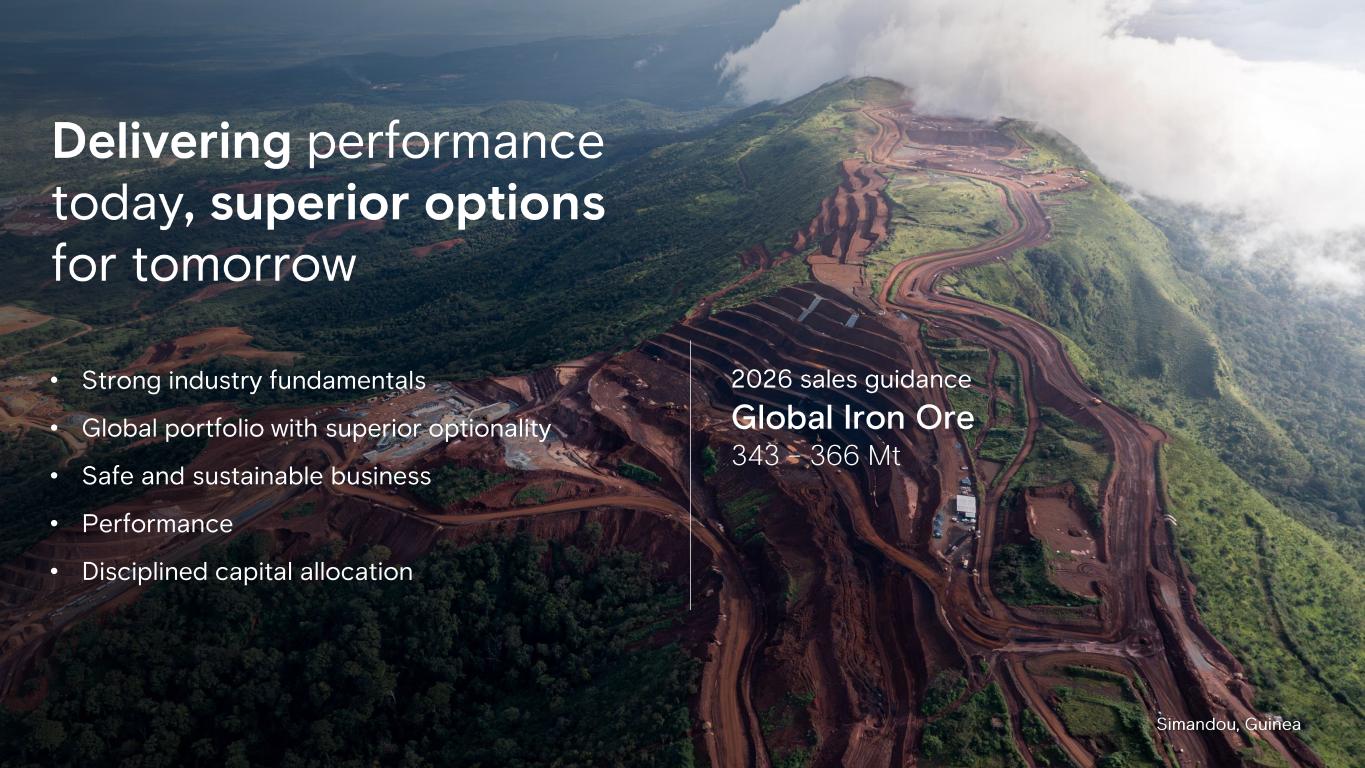 Global Iron Ore 343 – 366 Mt 2026 sales guidance• Strong industry fundamentals • Global portfolio with superior optionality • Safe and sustainable business • Performance • Disciplined capital allocation Simandou , Guinea Delivering performance today , superior options for tomorrow