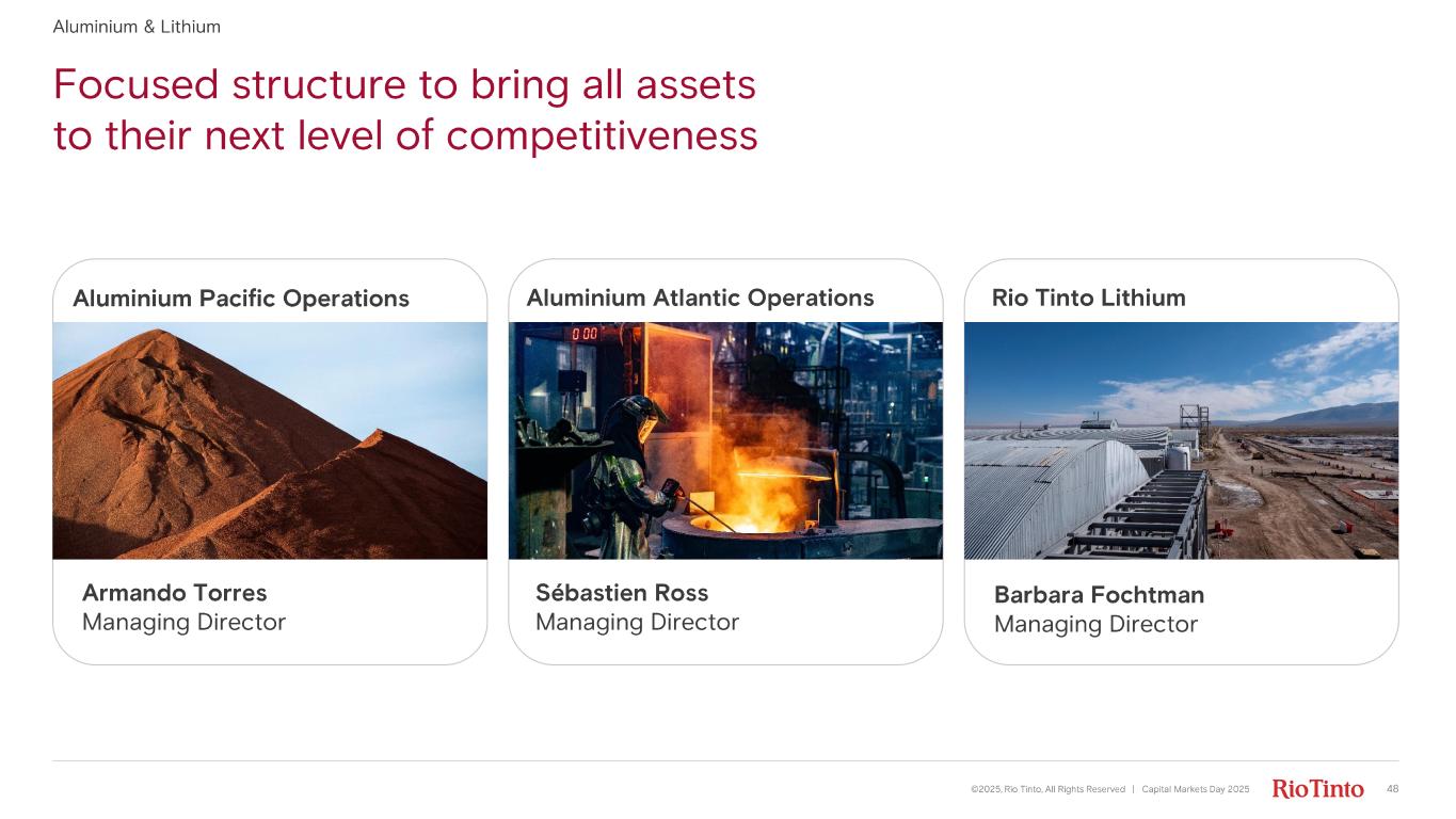Focused structure to bring all assets to their next level of competitiveness ©2025, Rio Tinto, All Rights Reserved | Capital Markets Day 2025 48 Aluminium & Lithium Aluminium Atlantic OperationsAluminium Pacific Operations Rio Tinto Lithium Armando Torres Managing Director Sébastien Ross Managing Director Barbara Fochtman Managing Director