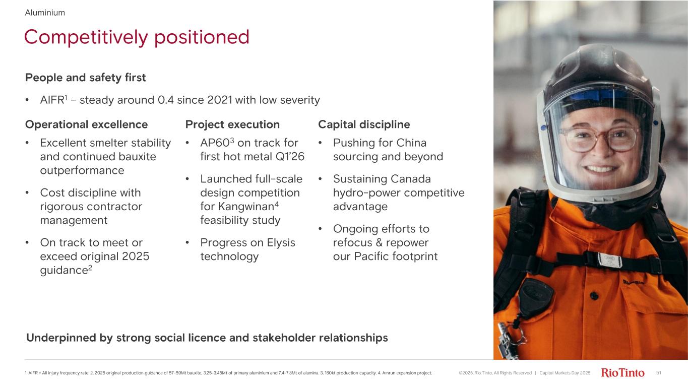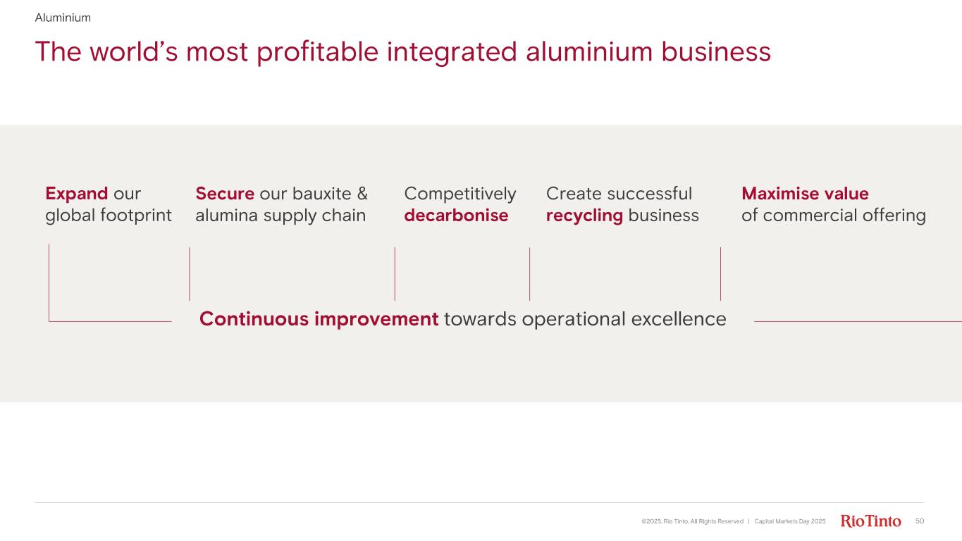 The world’s most profitable integrated aluminium business ©2025, Rio Tinto, All Rights Reserved | Capital Markets Day 2025 Aluminium Secure our bauxite & alumina supply chain Competitively decarbonise Create successful recycling business Maximise value of commercial offering Continuous improvement towards operational excellence Expand our global footprint 50