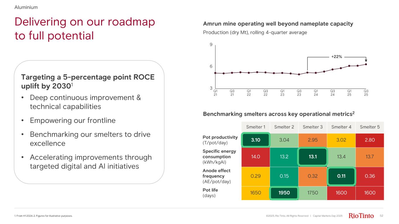 People and safety first • AIFR 1 – steady around 0.4 since 2021 with low severity Competitively positioned ©2025, Rio Tinto, All Rights Reserved | Capital Markets Day 2025 1. AIFR = All injury frequency rate. 2. 2025 original production guidance of 57 - 59Mt bauxite, 3.25 - 3.45Mt of primary aluminium and 7.4 - 7.8Mt of alumina. 3. 160kt production capacity. 4. Amrun expansion project. Aluminium Operational excellence Project execution Capital discipline • Excellent smelter stability and continued bauxite outperformance • Cost discipline with rigorous contractor management • On track to meet or exceed original 2025 guidance 2 • AP60 3 on track for first hot metal Q1’26 • Launched full - scale design competition for Kangwinan 4 feasibility study • Progress on Elysis technology • Pushing for China sourcing and beyond • Sustaining Canada hydro - power competitive advantage • Ongoing efforts to refocus & repower our Pacific footprint Underpinned by strong social licence and stakeholder relationships 51