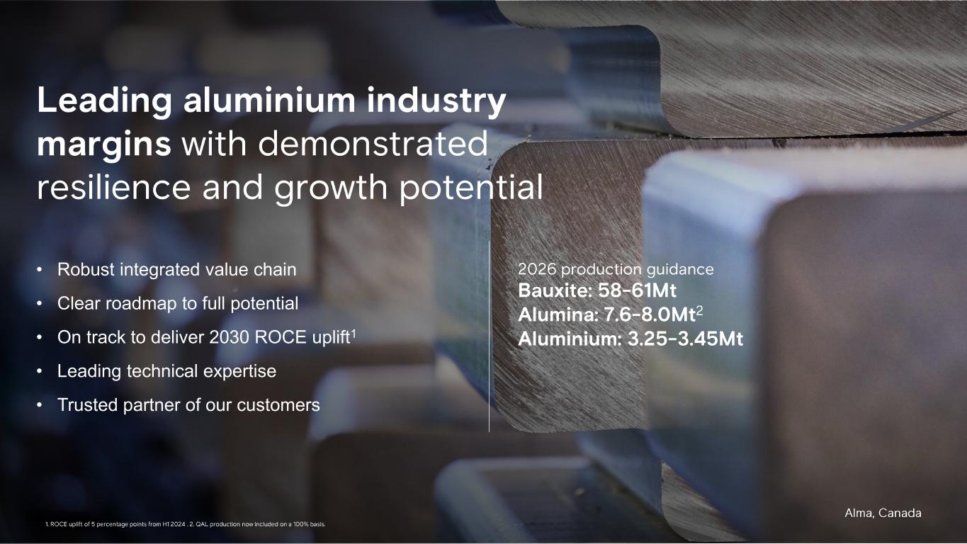 Leading aluminium industry margins with demonstrated resilience and growth potential • Robust integrated value chain • Clear roadmap to full potential • On track to deliver 2030 ROCE uplift1 • Leading technical expertise • Trusted partner of our customers 2026 production guidance Bauxite: 58 - 61Mt Alumina: 7.6 - 8.0Mt 2 Aluminium: 3.25 - 3.45Mt 1. ROCE uplift of 5 percentage points from H1 2024 . 2. QAL production now included on a 100% basis. Alma, Canada