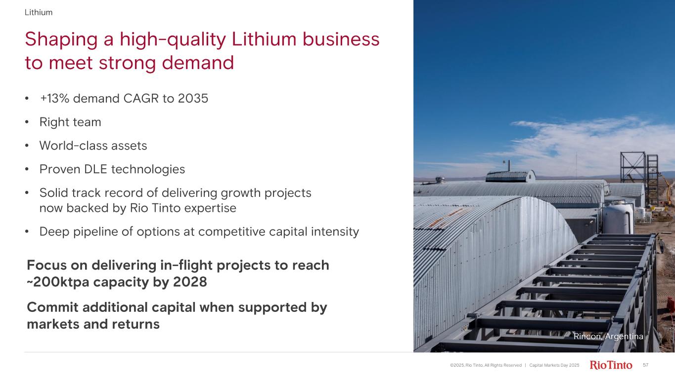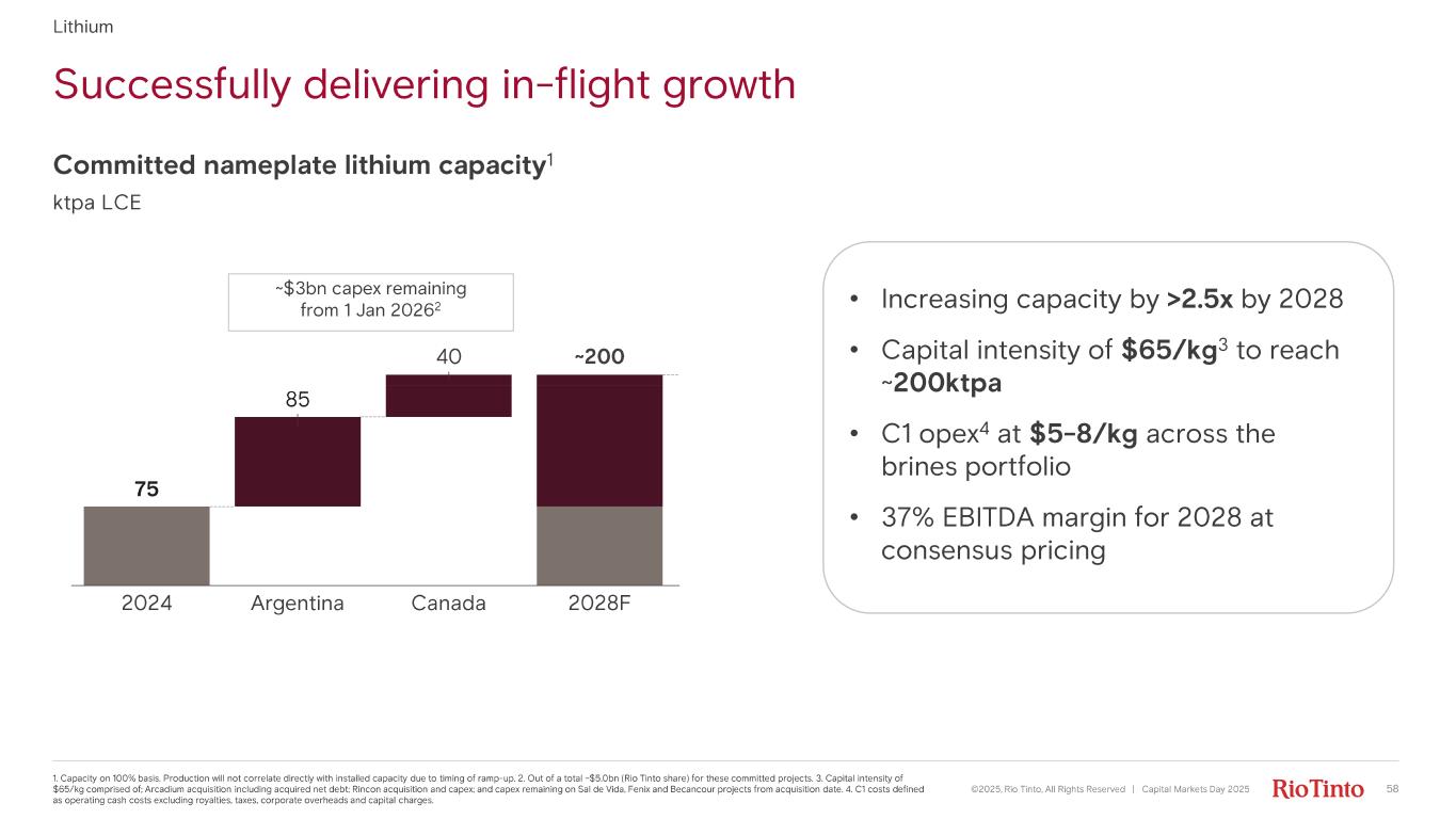 Shaping a high - quality Lithium business to meet strong demand ©2025, Rio Tinto, All Rights Reserved | Capital Markets Day 2025 Lithium • +13% demand CAGR to 2035 • Right team • World - class assets • Proven DLE technologies • Solid track record of delivering growth projects now backed by Rio Tinto expertise • Deep pipeline of options at competitive capital intensity Focus on delivering in - flight projects to reach ~200ktpa capacity by 2028 Commit additional capital when supported by markets and returns Rincon, Argentina 57
