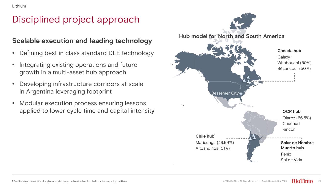 Disciplined project approach ©2025, Rio Tinto, All Rights Reserved | Capital Markets Day 2025 1. Remains subject to receipt of all applicable regulatory approvals and satisfaction of other customary closing conditions. Lithium Canada hub Galaxy Whabouchi (50%) Bécancour (50%) Bessemer City Chile hub 1 Maricunga (49.99%) Altoandinos (51%) OCR hub Olaroz (66.5%) Cauchari Rincon Salar de Hombre Muerto hub Fenix Sal de Vida Hub model for North and South America Scalable execution and leading technology • Defining best in class standard DLE technology • Integrating existing operations and future growth in a multi - asset hub approach • Developing infrastructure corridors at scale in Argentina leveraging footprint • Modular execution process ensuring lessons applied to lower cycle time and capital intensity 59