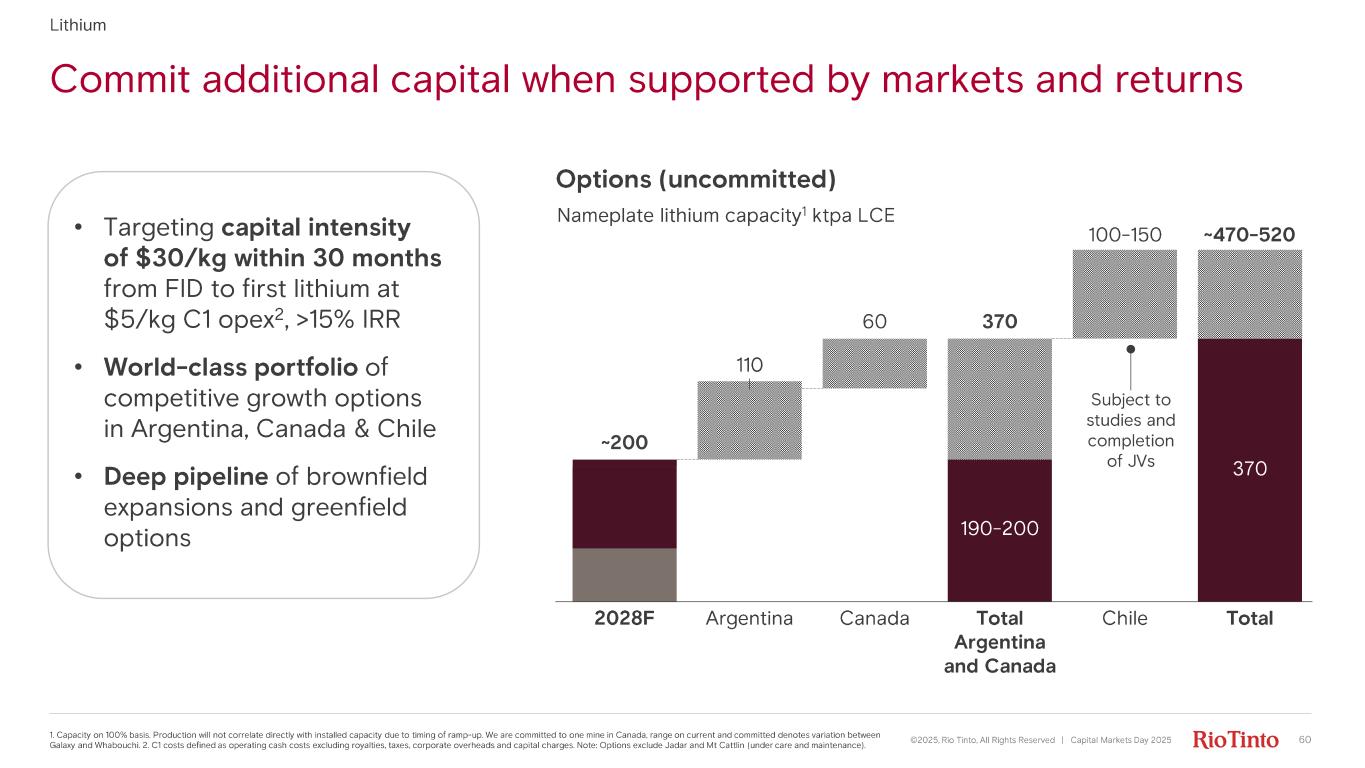 ©2025, Rio Tinto, All Rights Reserved | Capital Markets Day 2025 1. Capacity on 100% basis. Production will not correlate directly with installed capacity due to timing of ramp - up. We are committed to one mine in Canada, range on current and committed denotes variation between Galaxy and Whabouchi . 2. C1 costs defined as operating cash costs excluding royalties, taxes, corporate overheads and capital charges. Note: Options exclude Jadar and Mt Cattlin (under care and maintenance). Lithium Lithium 75 37085 110 Arcadium 2024 nameplate capacity Argentina 30 - 40 Canada 2028F Argentina Canada 190- 200 Total Argentina and Canada Chile Total ~200 60 370 • Targeting capital intensity of $30/kg within 30 months from FID to first lithium at $5/kg C1 opex 2, >15% IRR • World - class portfolio of competitive growth options in Argentina, Canada & Chile • Deep pipeline of brownfield expansions and greenfield options Subject to studies and completion of JVs Nameplate lithium capacity 1 ktpa LCE Options (uncommitted) 100 - 150 ~470 - 520 Commit additional capital when supported by markets and returns 60