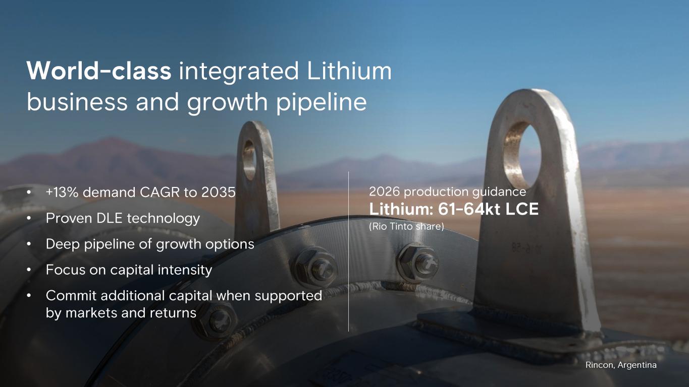 World - class integrated Lithium business and growth pipeline • +13% demand CAGR to 2035 • Proven DLE technology • Deep pipeline of growth options • Focus on capital intensity • C ommit additional capital when supported by markets and returns 2026 production guidance Lithium: 61 - 64kt LCE (Rio Tinto share) Rincon, Argentina